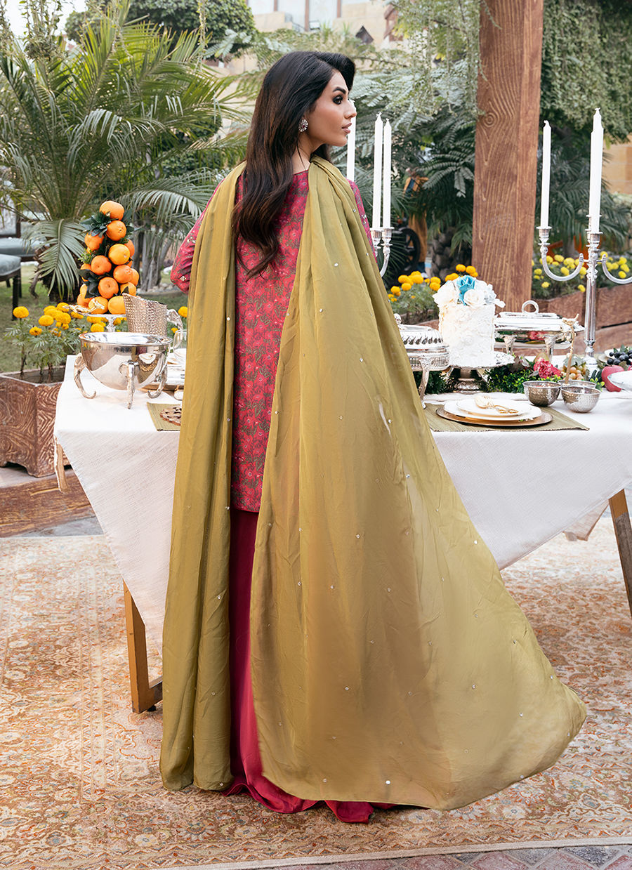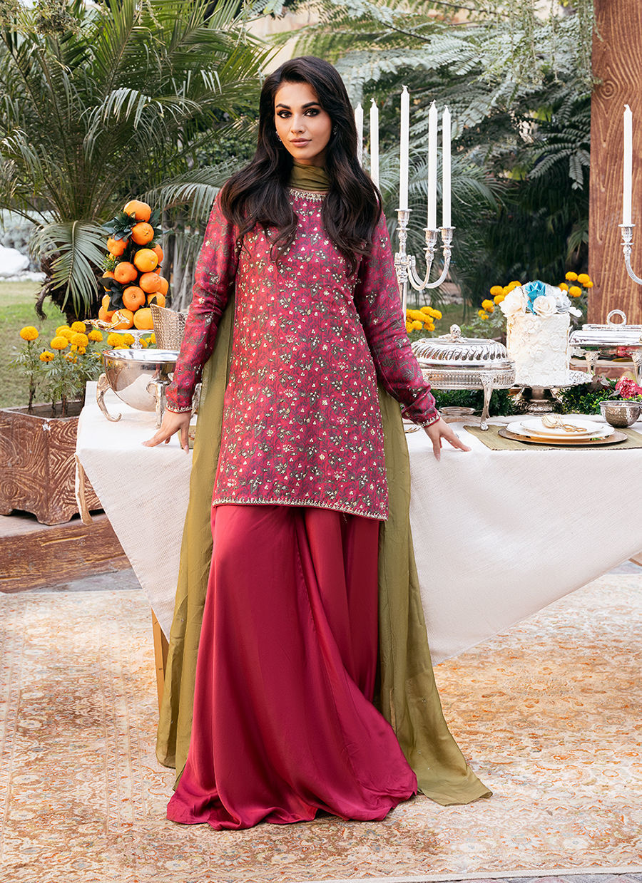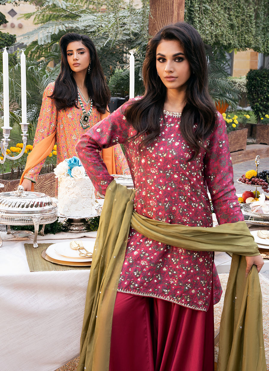 Digitally printed Short shirt crafted from pure raw silk, adorned with a delicate all-over floral. The shirt is further enhanced with subtle hand embellishments. It is paired with Satin silk flowy pants, designed to complement the look with their structured silhouette it. Completing the ensemble is a flowing KP SILK dupatta, draped effortlessly to add lightness and movement, beautifully balancing the richness of the silk textures.