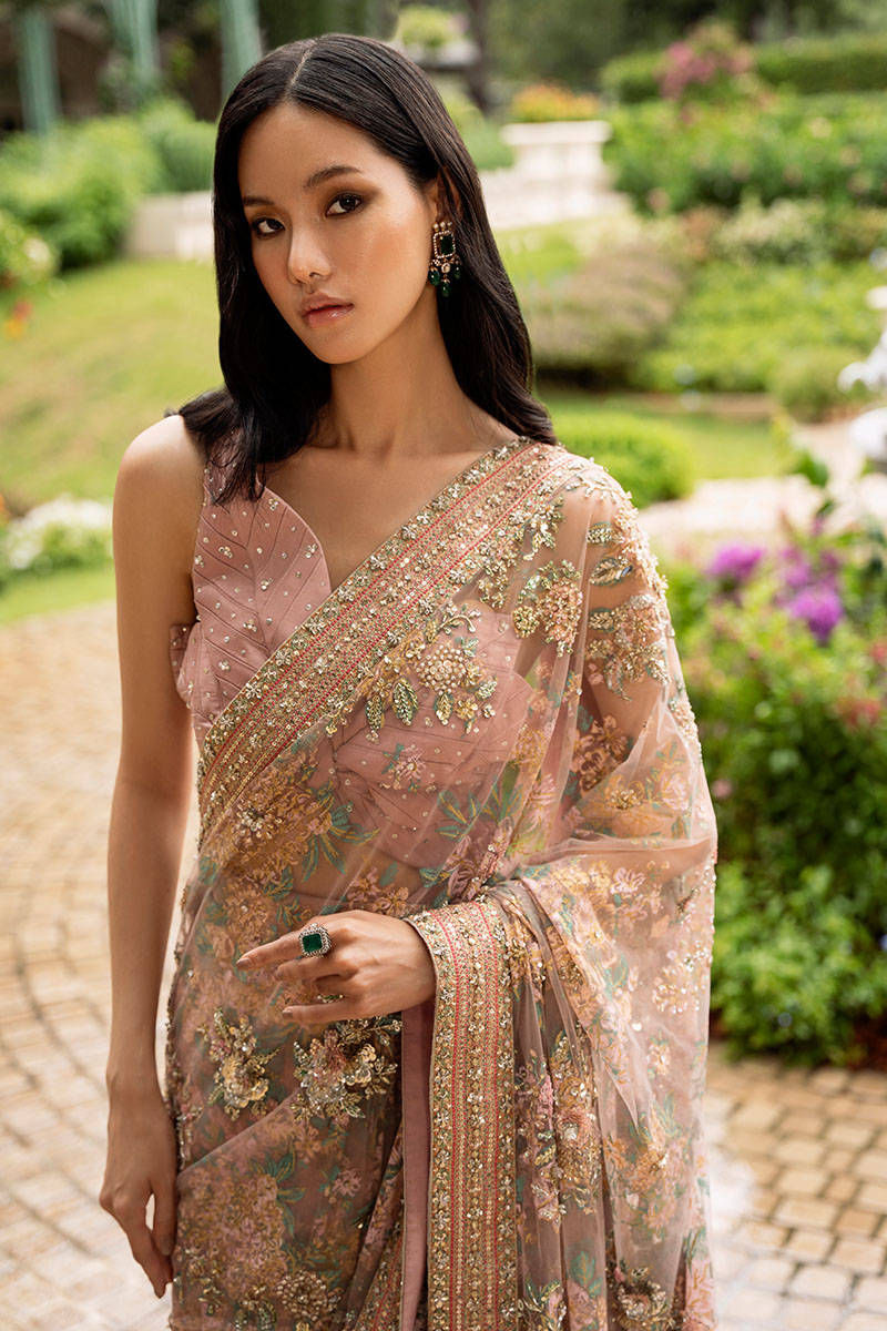 An immaculate vision of grandeur, this powder pink floral-printed saree is an essential addition this wedding season. The saree is adorned with elaborate borders and features intricate craftsmanship, including zardozi, dabka, and Swarovski embellishments, imparting a regal appearance. The saree is paired with a delicate blouse embellished with beadwork to maintain the outfit's elegant balance. Additionally, it includes a stunning organza ruffled pallu, enhancing the overall regal effect of the ensemble. Saree Length: 46 Blouse Length: 7 Model Height: 5'5