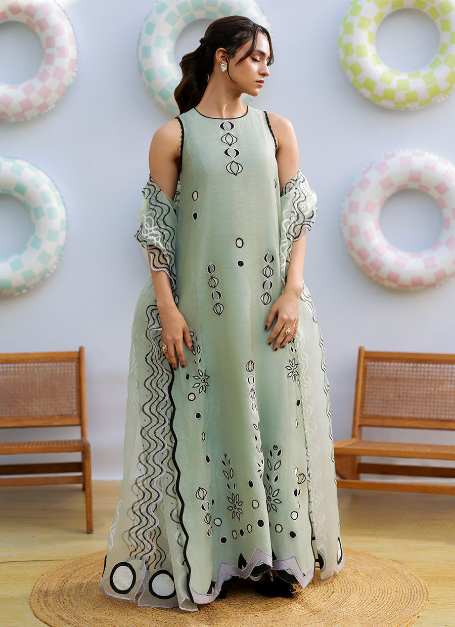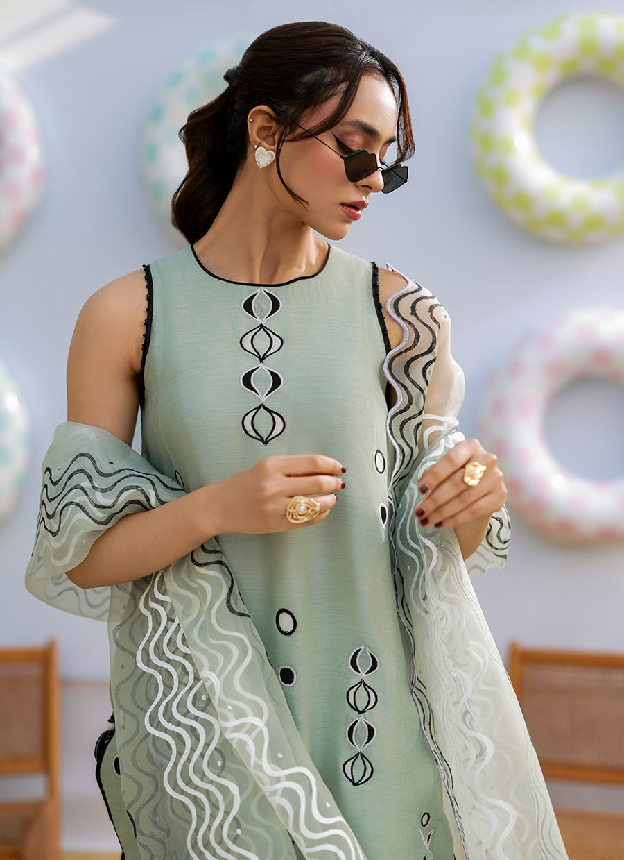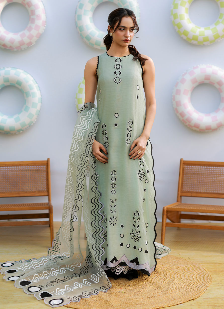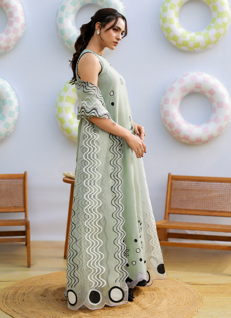 A sage green khaddi silk outfit featuring white, black, and lavender sheesha silk appliqués with wavy and polka dot patterns. Paired with a block-printed pure organza dupatta, it combines playful detailing with effortless elegance.
