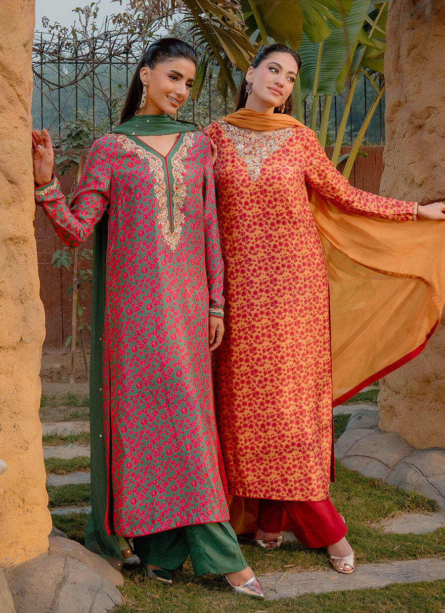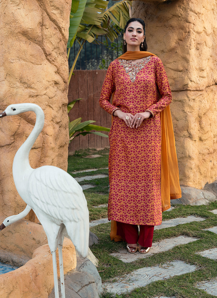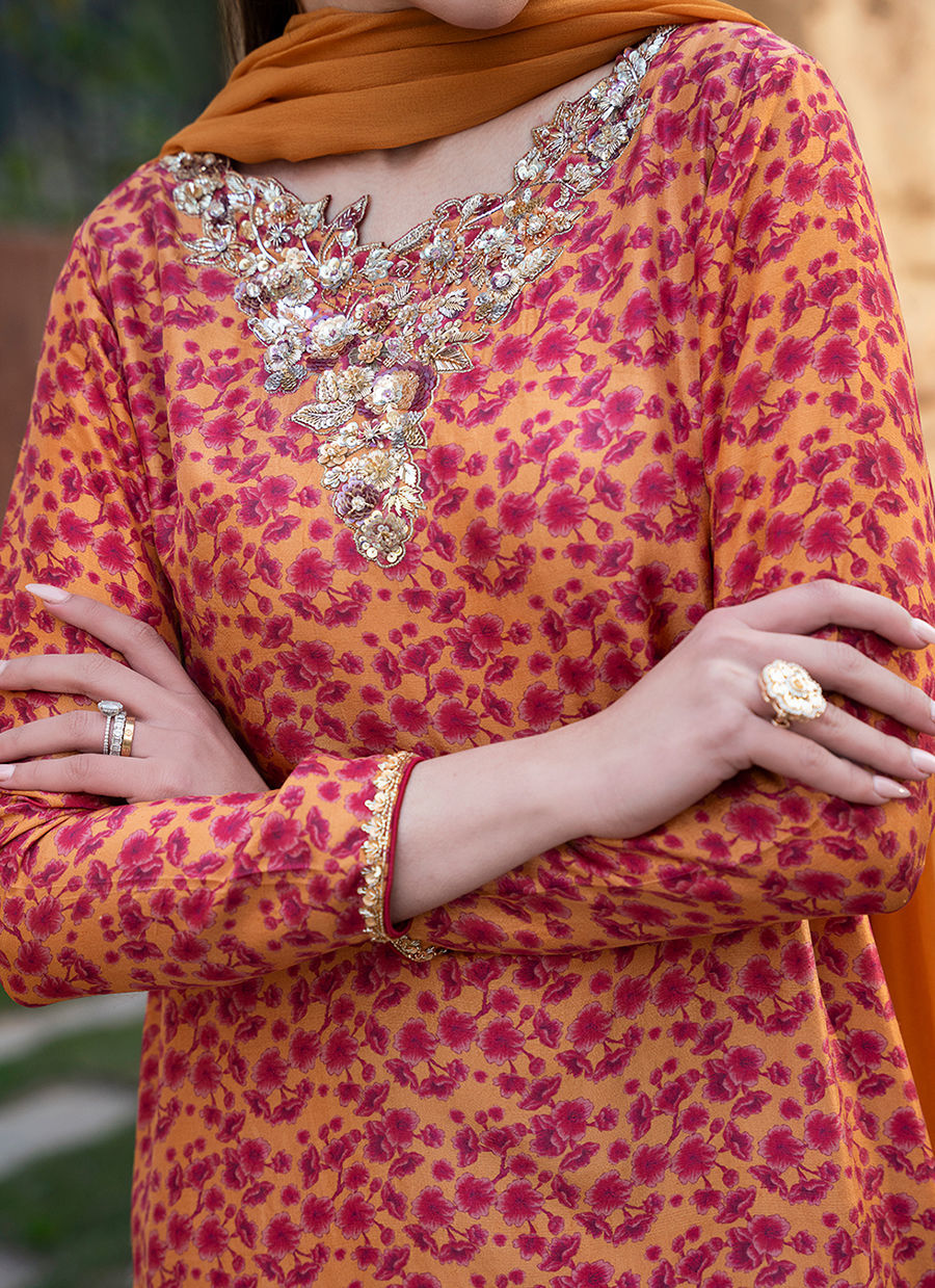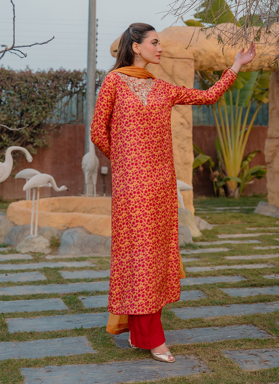 Digitally printed Shirt manufactured from pure raw silk, adorned with delicate florals. The shirt is further enhanced with subtle hand embellishments, adding a touch of artisanal detail while maintaining a soft, graceful aesthetic. It is paired with PK raw silk pants, designed to complement the look with their structured silhouette. Completing the ensemble is a flowing chiffon dupatta, draped effortlessly to add lightness and movement, beautifully balancing the richness of the silk textures.