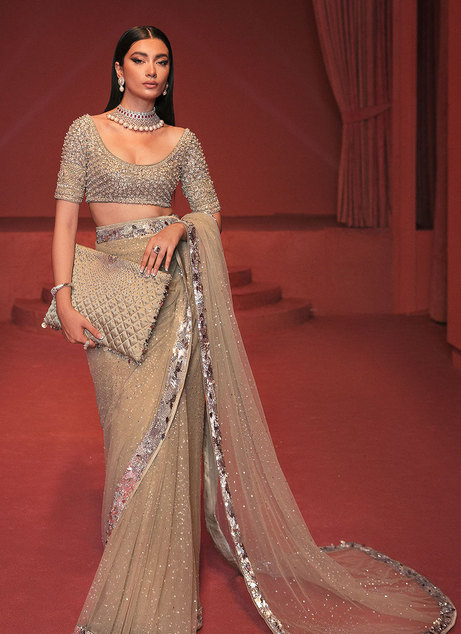 Pistachio net blouse heavily embellished with dainty details of silver nakshi, sequins, cutdana and Swarovski. It has a round neckline and Indian sleeves. The Saree has a sparkly silver sequin border and chatta of Swarovski all over It.