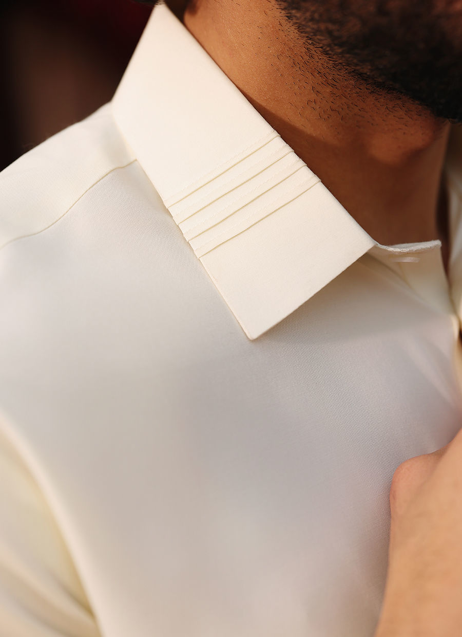 Graceful off-white ensemble designed with elegant pleated detailing on the collar and cuffs for a refined, textured finish. The front-buttoned style offers a clean and classic look, complemented by a front pocket and practical side pockets. A perfect blend of sophistication and subtle charm for any formal occasion.