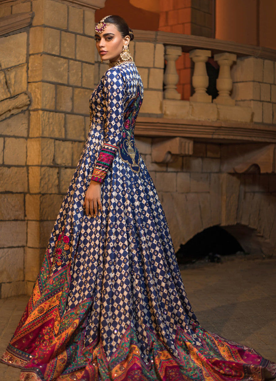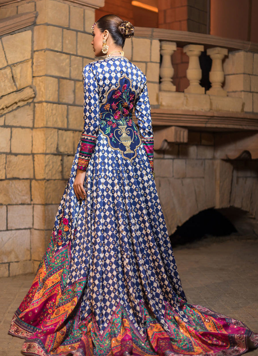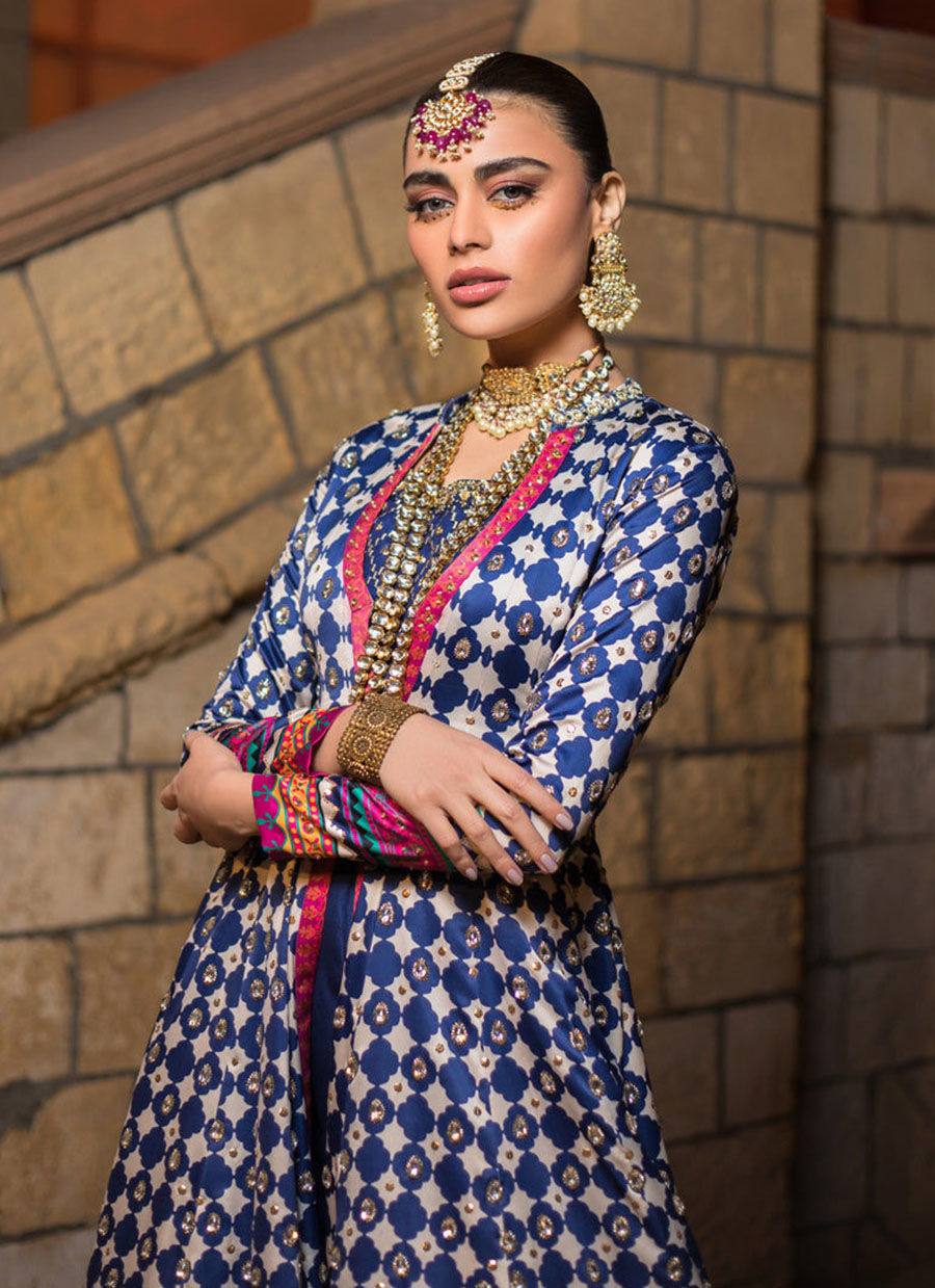 Be the queen of night in our digitally printed front open flared jacket The geometric pattern is highlighted with sequins and silver kundan all over along with colorful borders and embroidered floral vases. Back is highlighted with embroidered floral motif. It comes with embroidered and embellished inner slip and plain blue sharara. A truly exquisite ensemble that is sure to make heads turn this festive season.