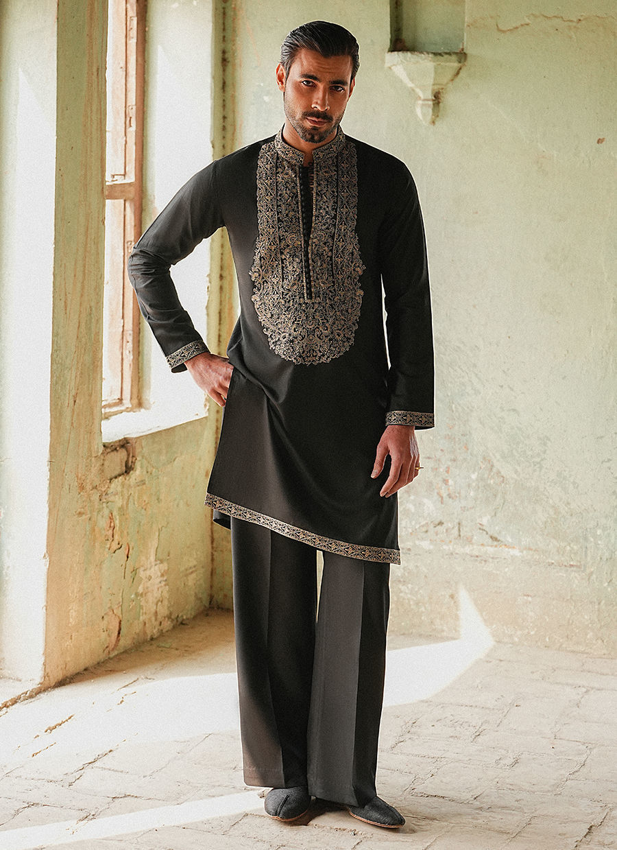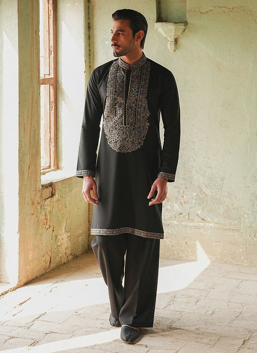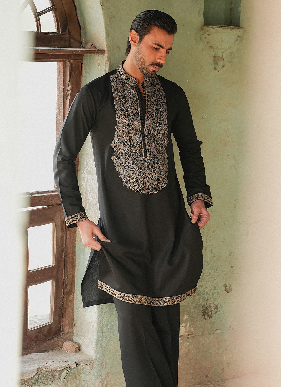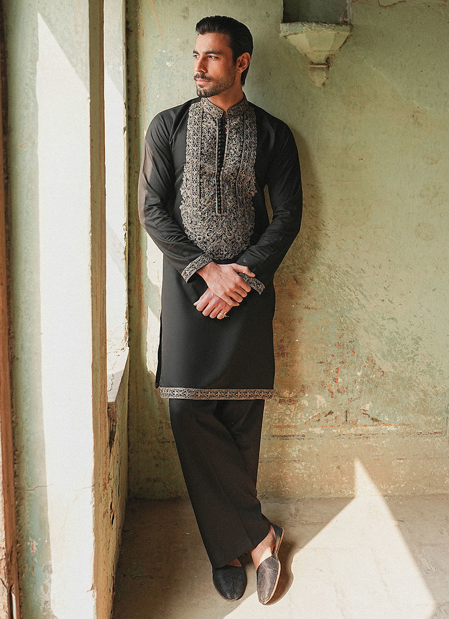 Color: Black Fabric: Cotton Linen Work Details: Neckline on Kurta , Border on Sleeves And Hem
