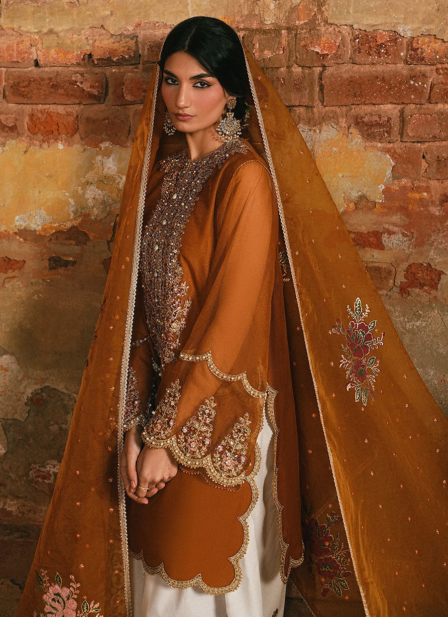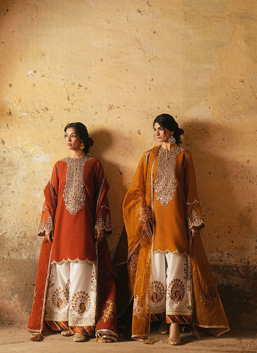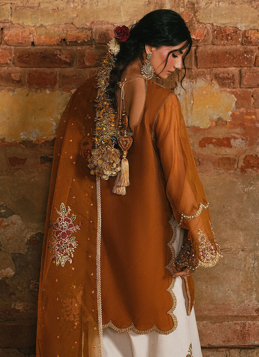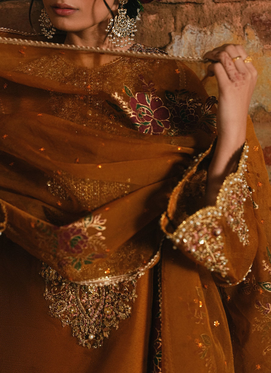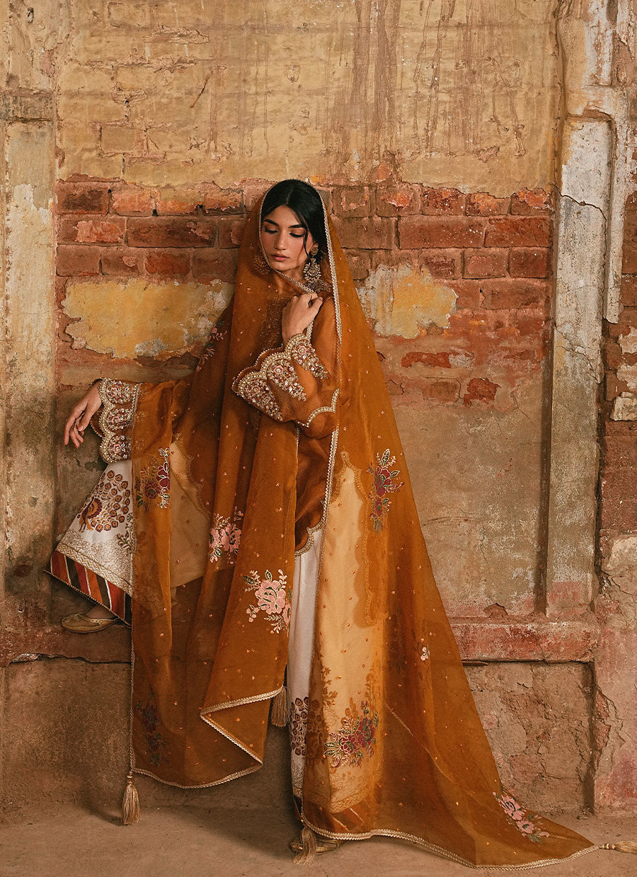 A mustard yellow check net shirt, featuring an intricately embroidered neckline with subtle adda accents, gracefully finished with a scalloped hem. It is paired with a double-chan organza dupatta, adorned with delicate floral block print motifs, and a paper silk shalwar showcasing an all-over block print, an embroidered hem, and detailed chatapati embellishments, creating a vibrant and elegantly textured ensemble.