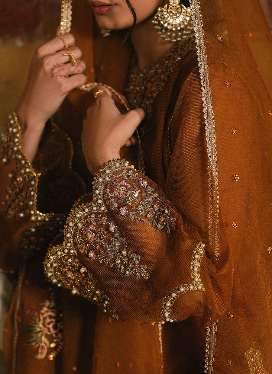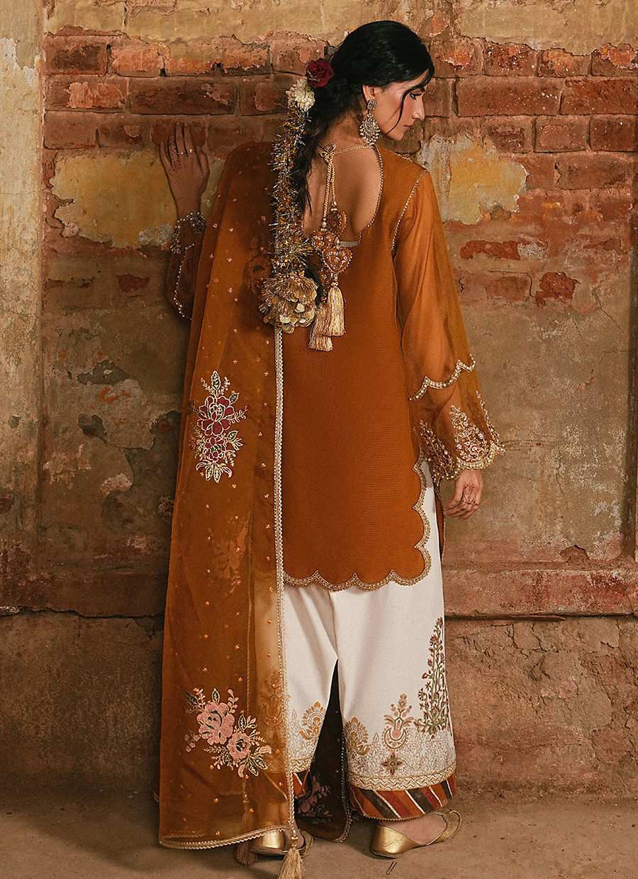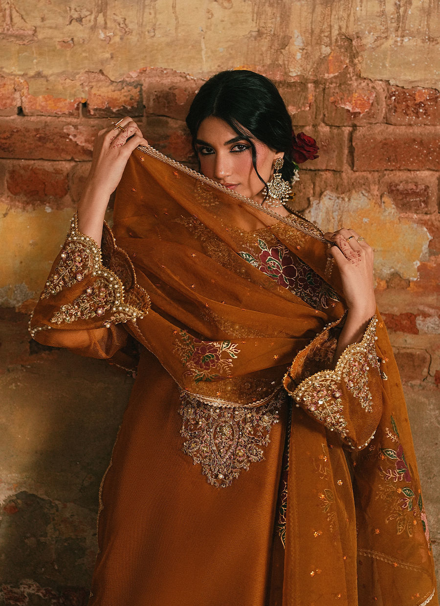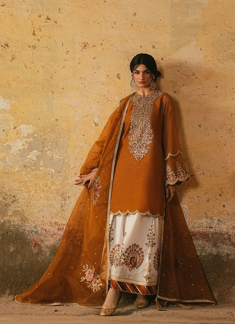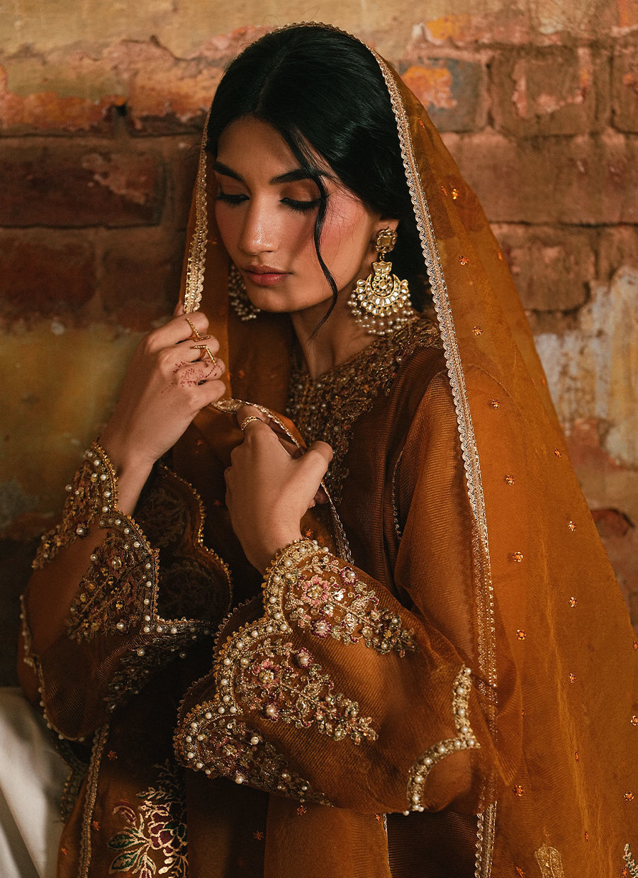A mustard yellow check net shirt, featuring an intricately embroidered neckline with subtle adda accents, gracefully finished with a scalloped hem. It is paired with a double-chan organza dupatta, adorned with delicate floral block print motifs, and a paper silk shalwar showcasing an all-over block print, an embroidered hem, and detailed chatapati embellishments, creating a vibrant and elegantly textured ensemble.