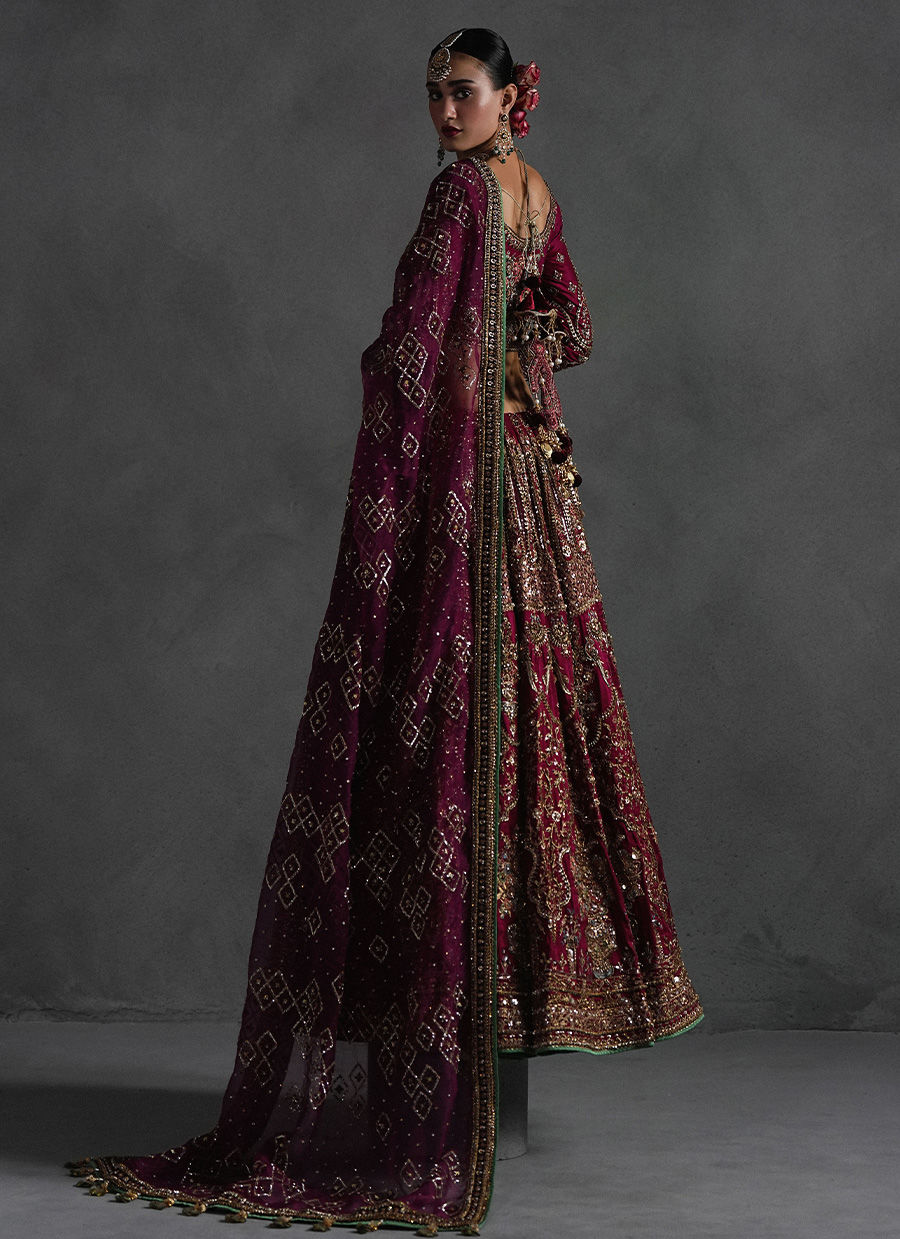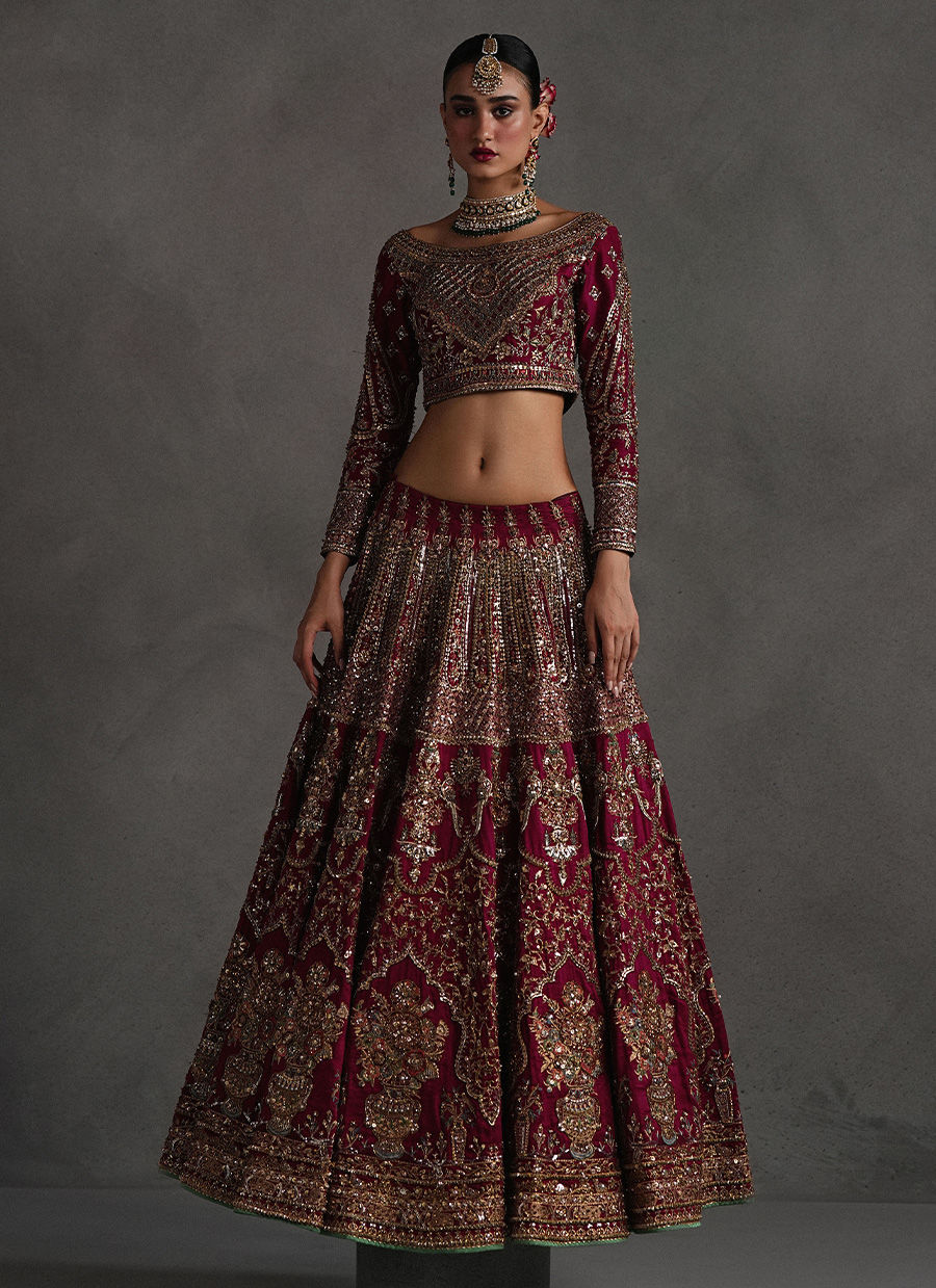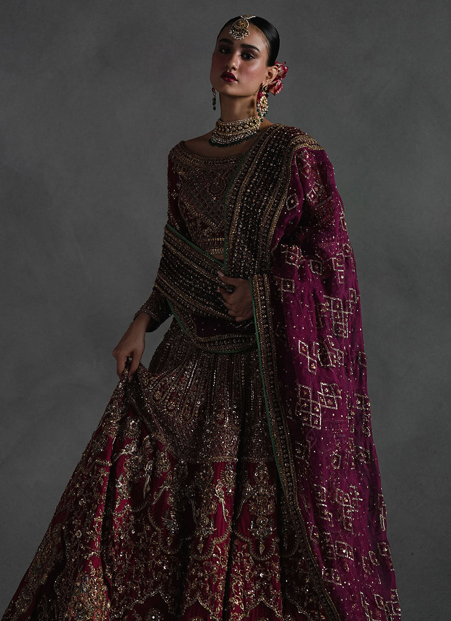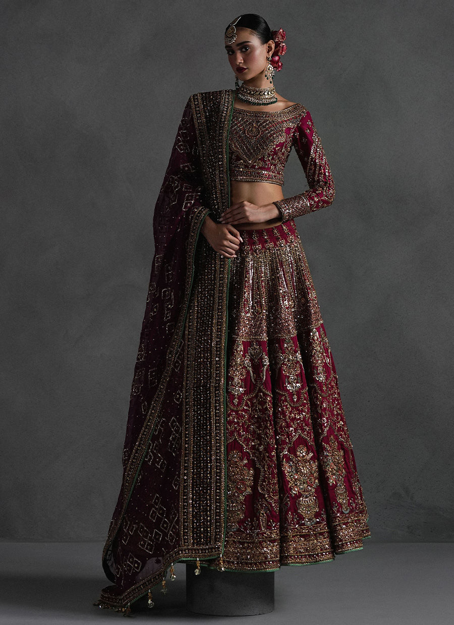 Kaif is our signature rich burgundy maroon colored bridal ensemble that will surely leave you spellbound with his impeccable design. It is adorned with luxurious embroidery that spans from hem to the neckline., the skirt features beautiful floral vases encased in symmetrical niches and accented with beautiful birds and vines.The bodice and sleeves featured intricate linear patterns, it is paired with coordinated marching diaphanous dupatta balancing the ensemble with simpler pairing featuring intricate embroidery along the borders and flirty tassels