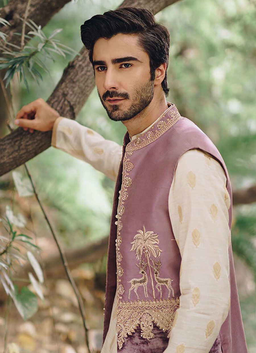 Nabeel wears Rawal, a lavender hued silk waistcoat decorated with heavily embroidered and hand embellished motifs inspired from shikargah karhai. It is paired with a creamy beige jacquard kameez shalwar with an embroidered neckline and paired with a lavender organza patka with sattu block details.