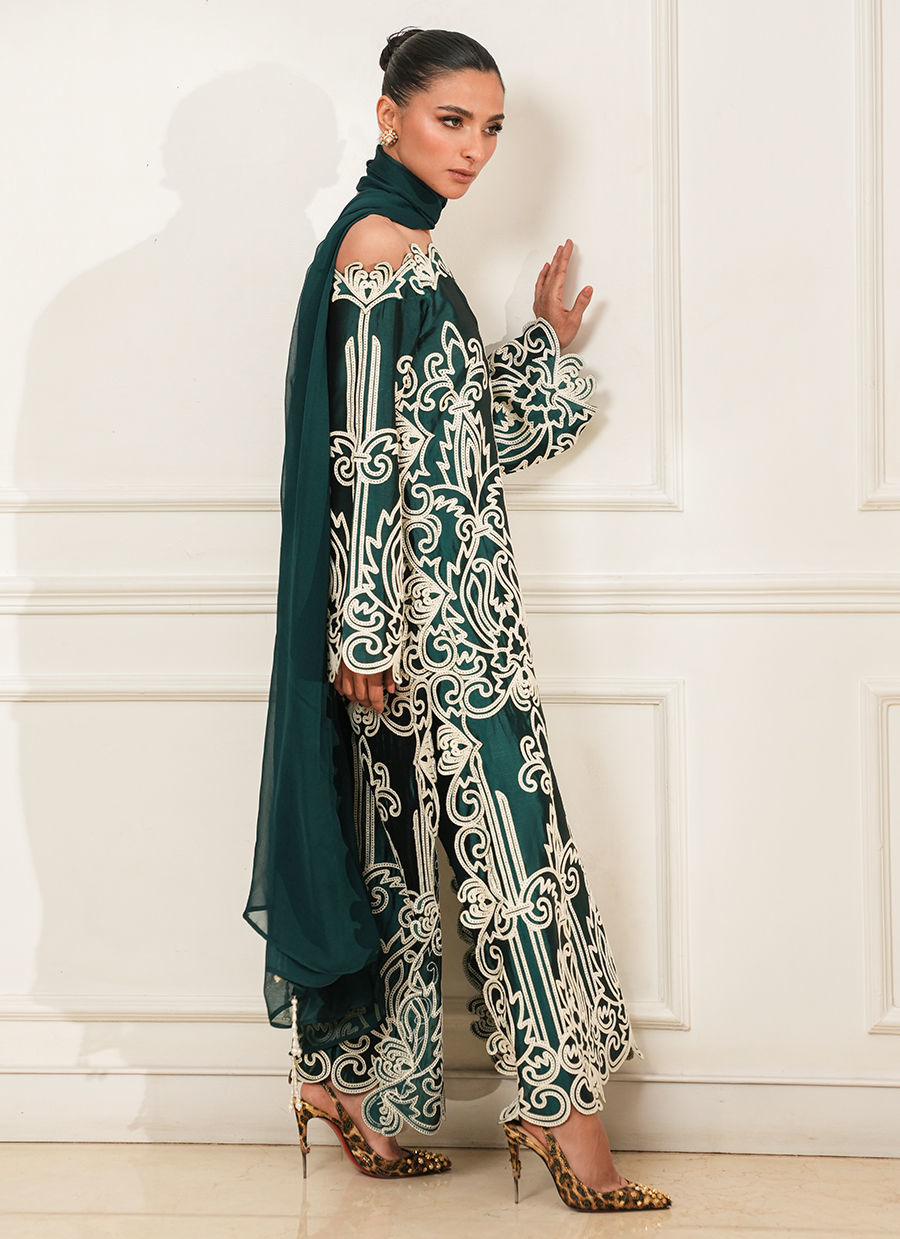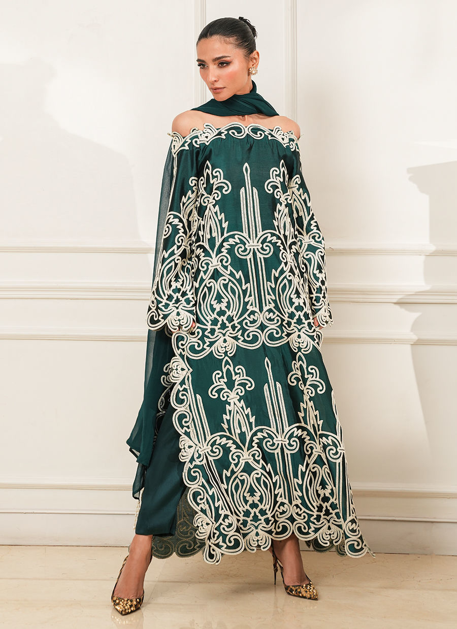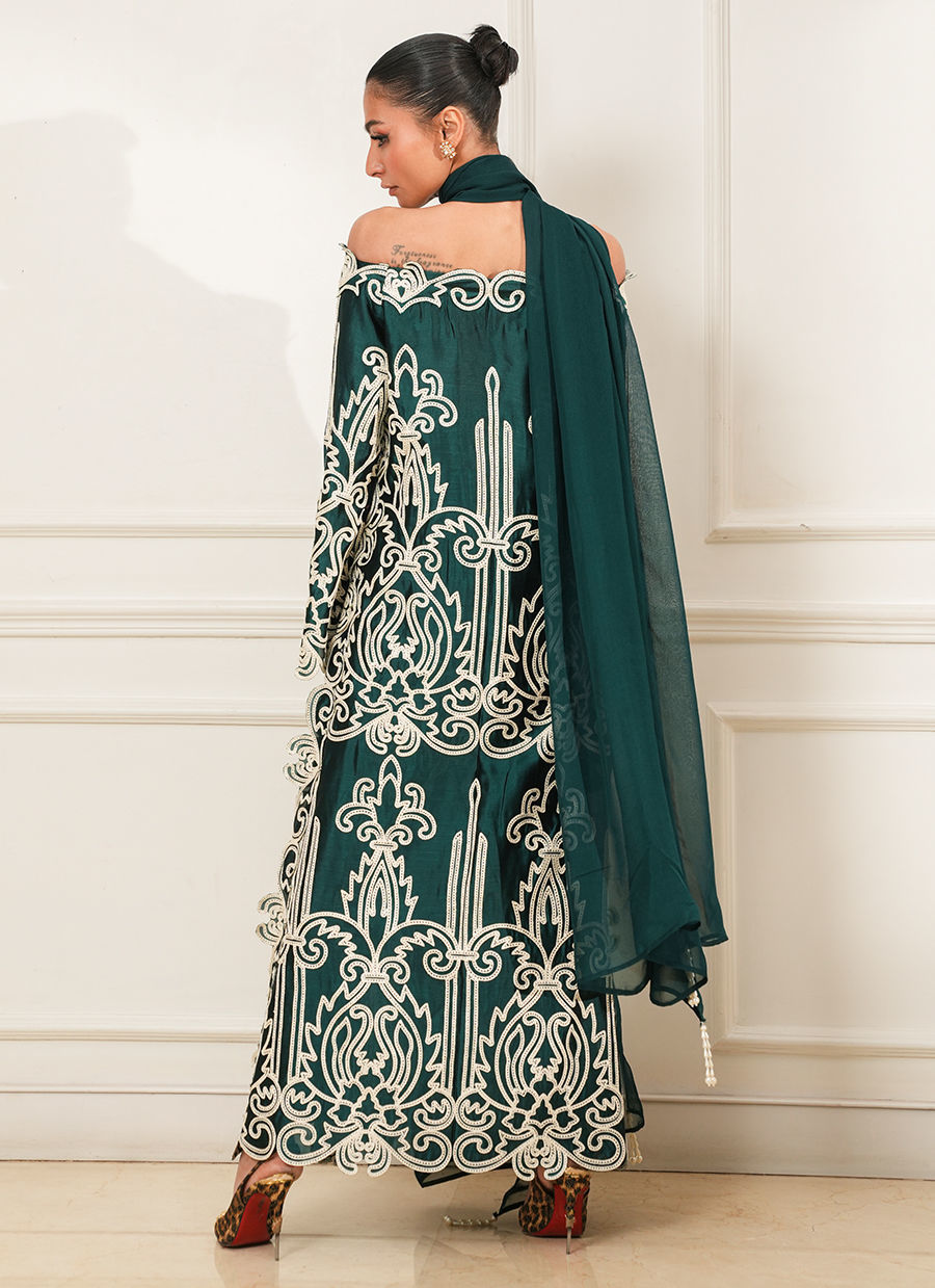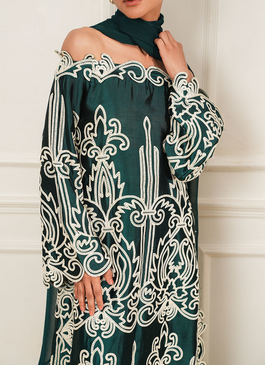 Off-shoulder silk shirt featuring all-over aari appliqué cutwork, paired with straight pants and a soft chiffon dupatta finished with pearl tassels along the sides.