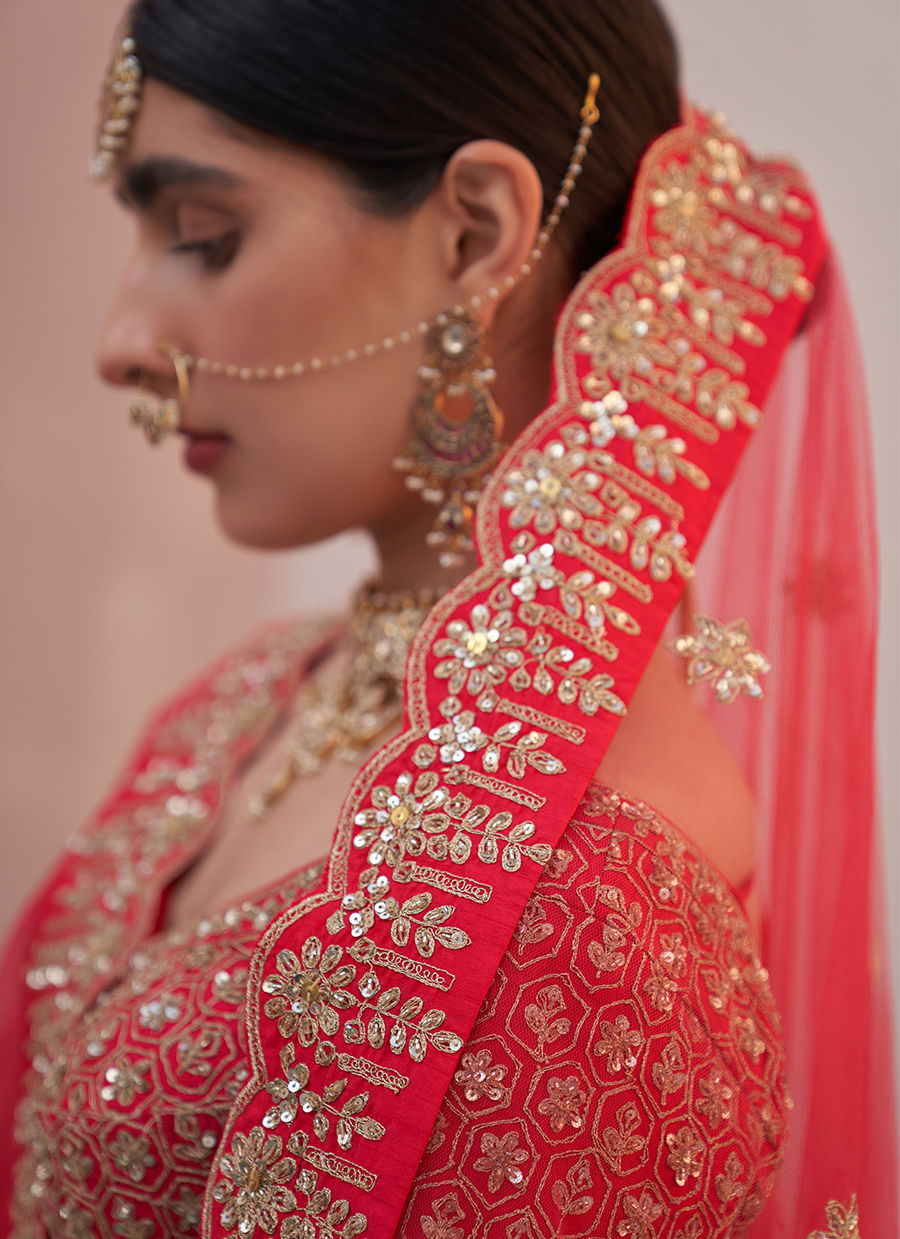 A red double dupatta lehenga set embroidered with traditional zardozi technique using silken threads, dabka, cutdana and sequins.