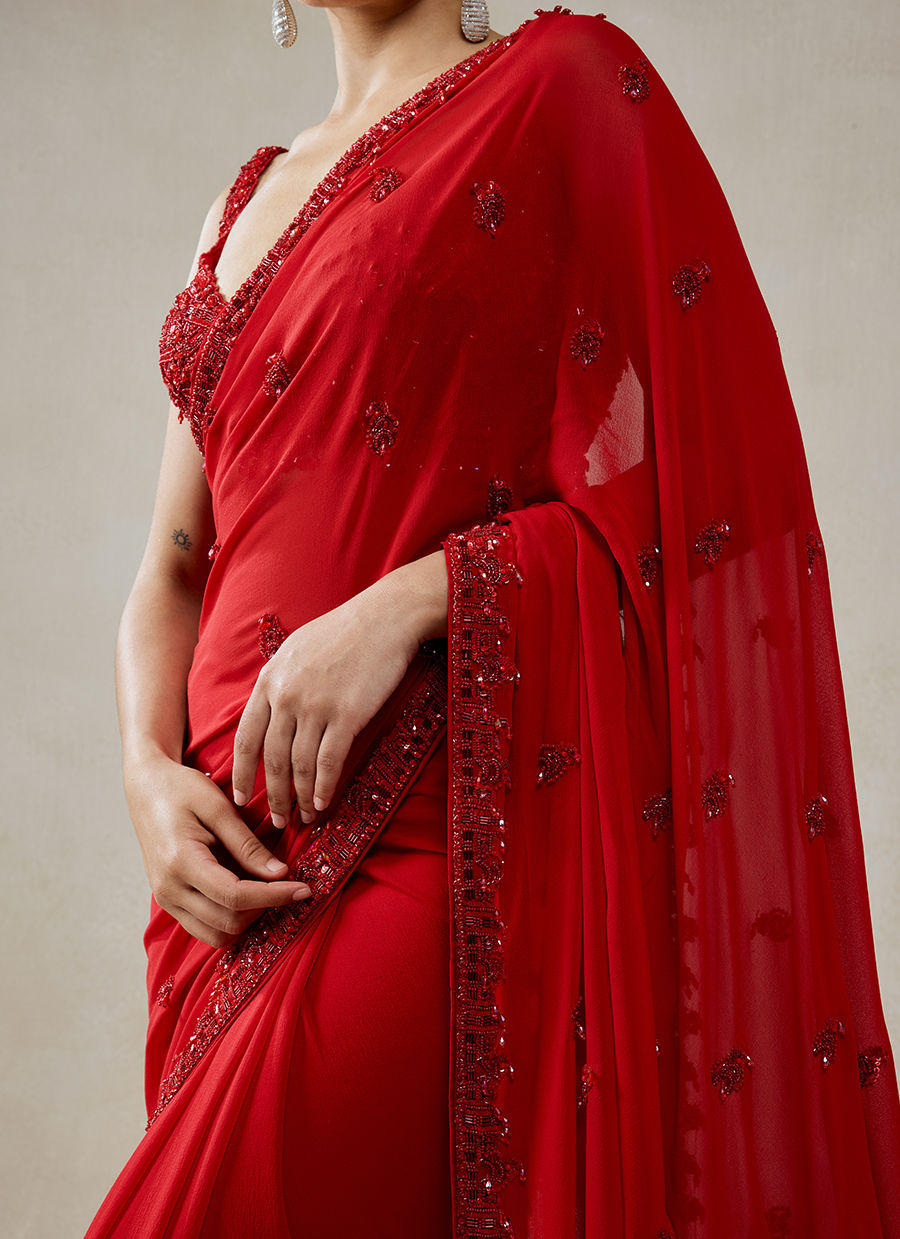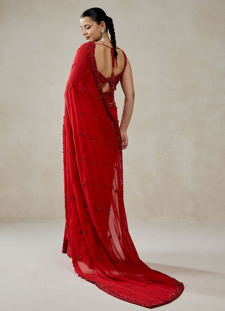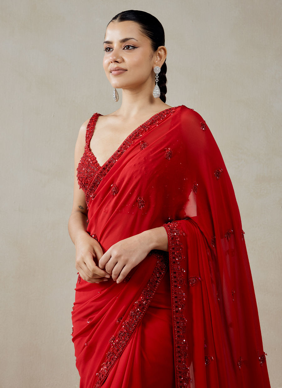 A striking draped saree ensemble that blends contemporary sensuality with timeless elegance, crafted in a fluid combination of georgette, satin, and shantoon. Delicately adorned with Scattered tonal embellishments across the saree for a subtle shimmer. A finely detailed border with intricate handwork, adding depth and definition. The blouse is richly embellished with Dense beadwork and sequin detailing, creating a textured, luminous surface. The pallu carries Light, evenly spaced embellishments, enhancing its sheer elegance without overwhelming the look.