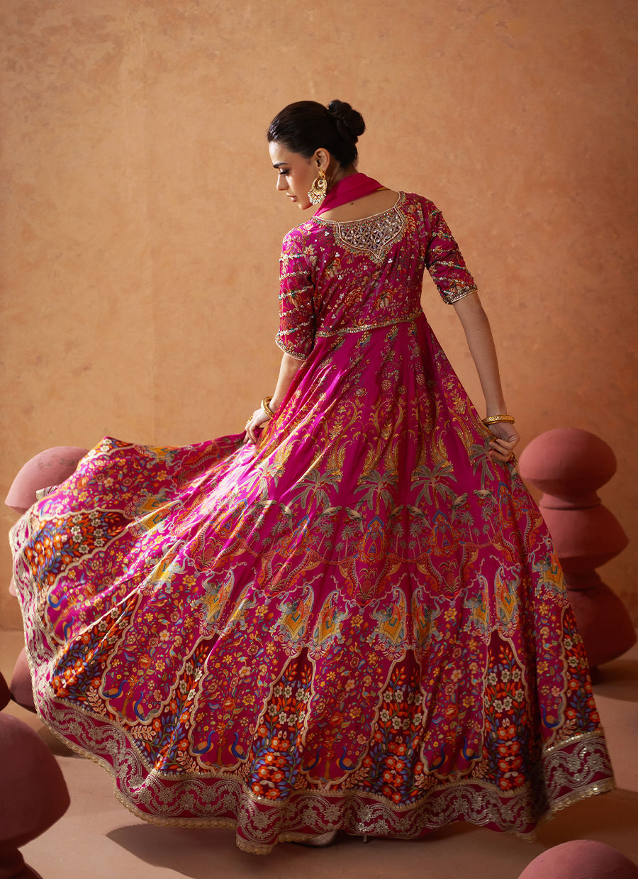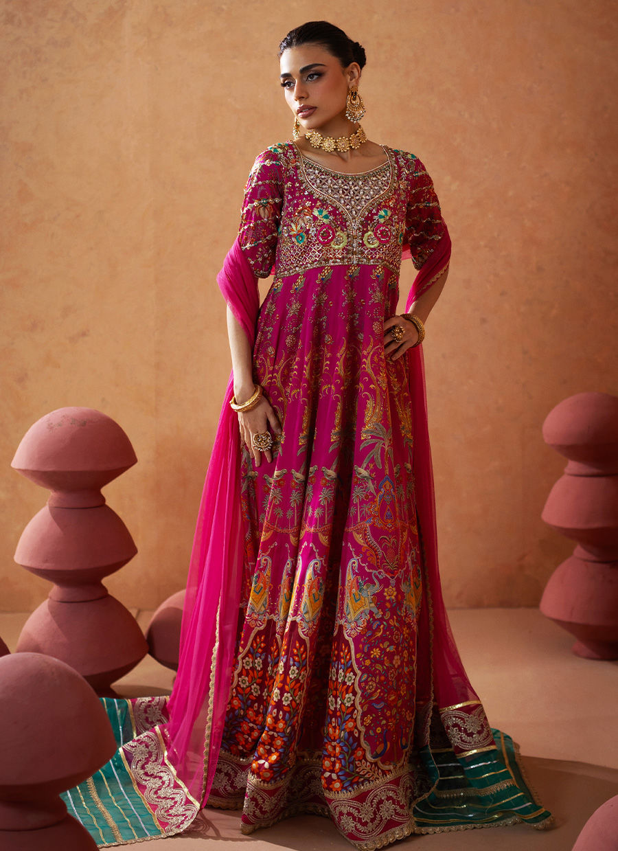 Floor-length Kalidar in a captivating shade of deep pink crafted from silk canvas, showcasing signature AA printed embellishments. The bodice is intricately adorned with zardozi and resham detailing in a harmonious blend of silver, gold, and antique tones. Accompanying the Kalidar is a net colour-blocked dupatta, which features an organza and zari embroidered panel embellished with gota accents. For a complete festive ensemble, the Kalidar may be elegantly paired with straight raw silk trousers.
