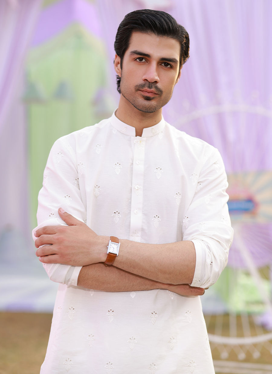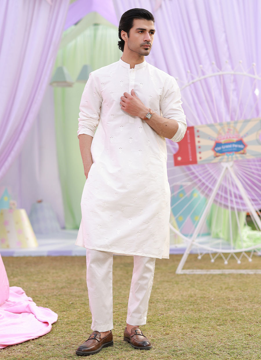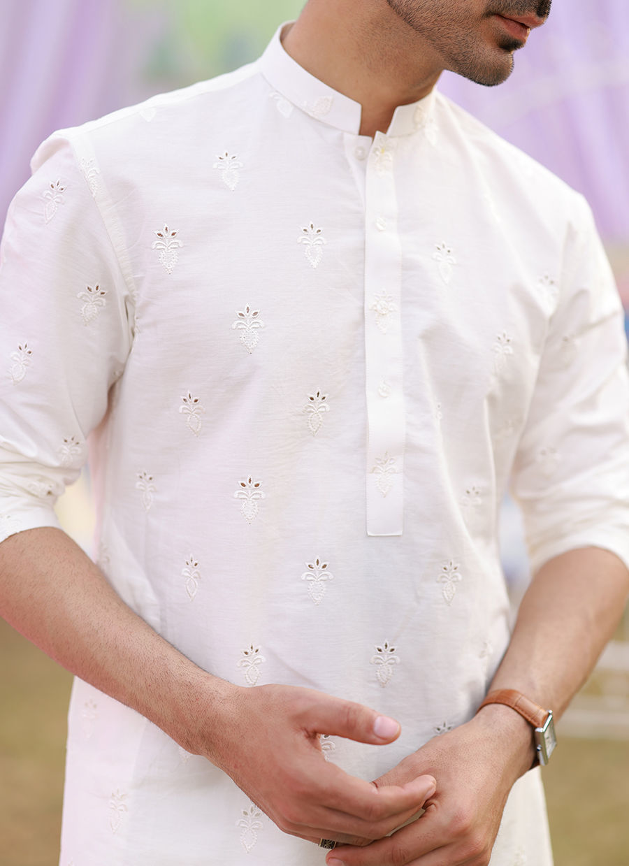 A white self embroidered kurta on cotton with white bareeze cotton straight pants.