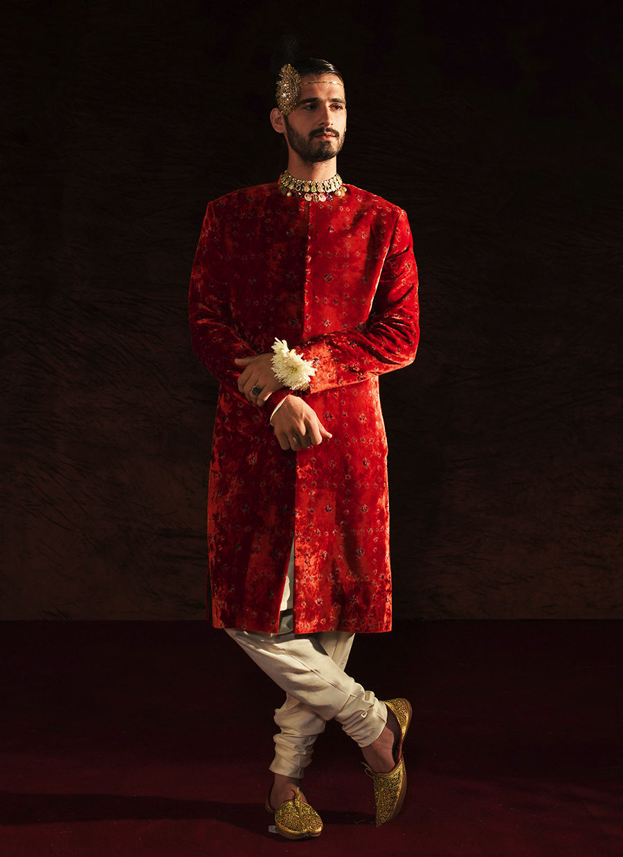 A rust velvet sherwani with chunri is a perfect blend of elegance and tradition. The chunri technique involves tie-dyeing small portions of the fabric with thread before dyeing, The fabric is made by pinching very small portions of cloth and tying into many tiny bindings that form a figurative design to form an intricate pattern of dots. This sherwani showcases the beauty of bandhani, adding a unique touch to your outfit. It's a timeless piece that will make you stand out on any special occasion!