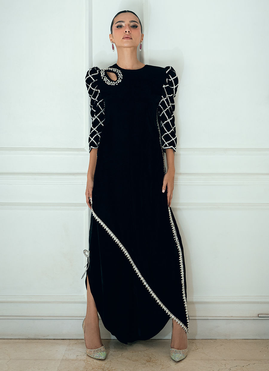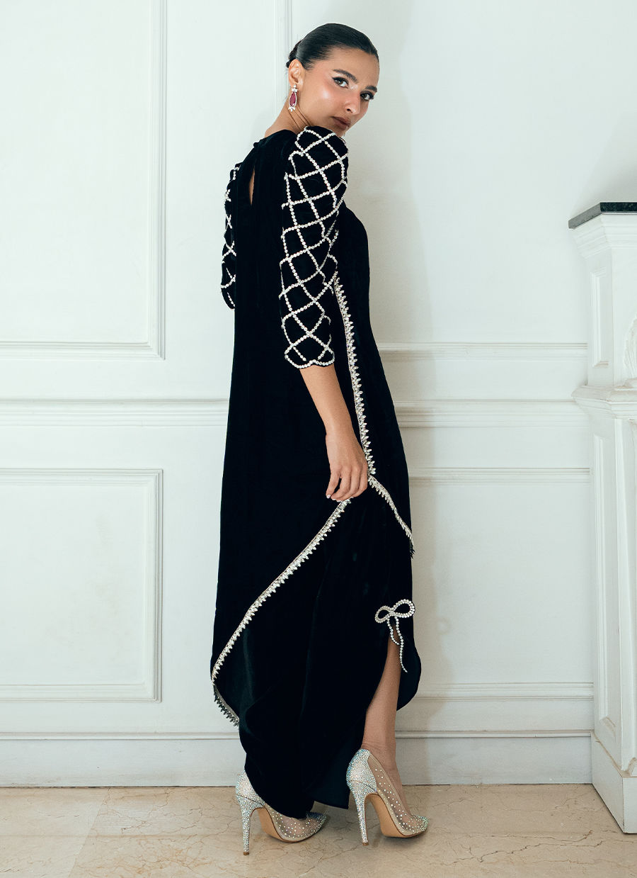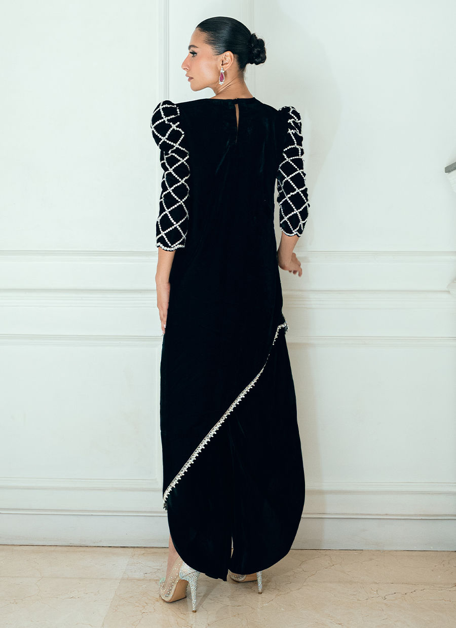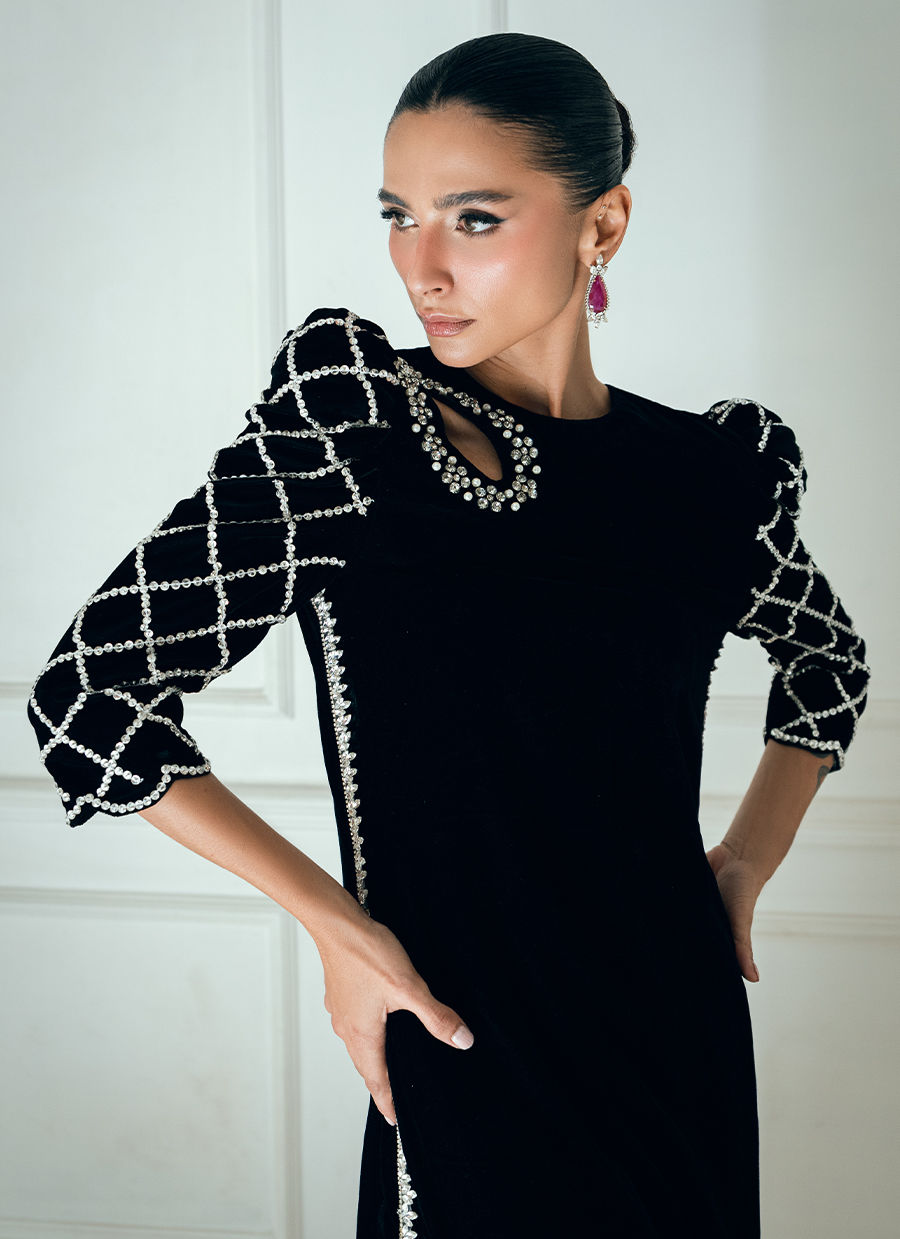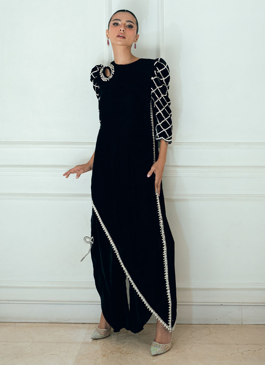 Rhea black velvet shirt and pants set showcases handmade diamante and pearl embellishments on the neckline and sleeves, paired with diamante borders on the damaan and sides. Styled with butterfly pants featuring a 3D butterfly accent.