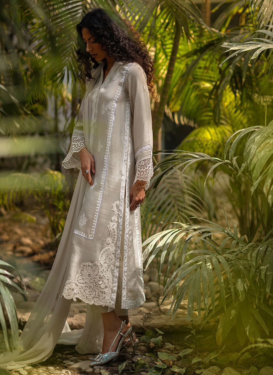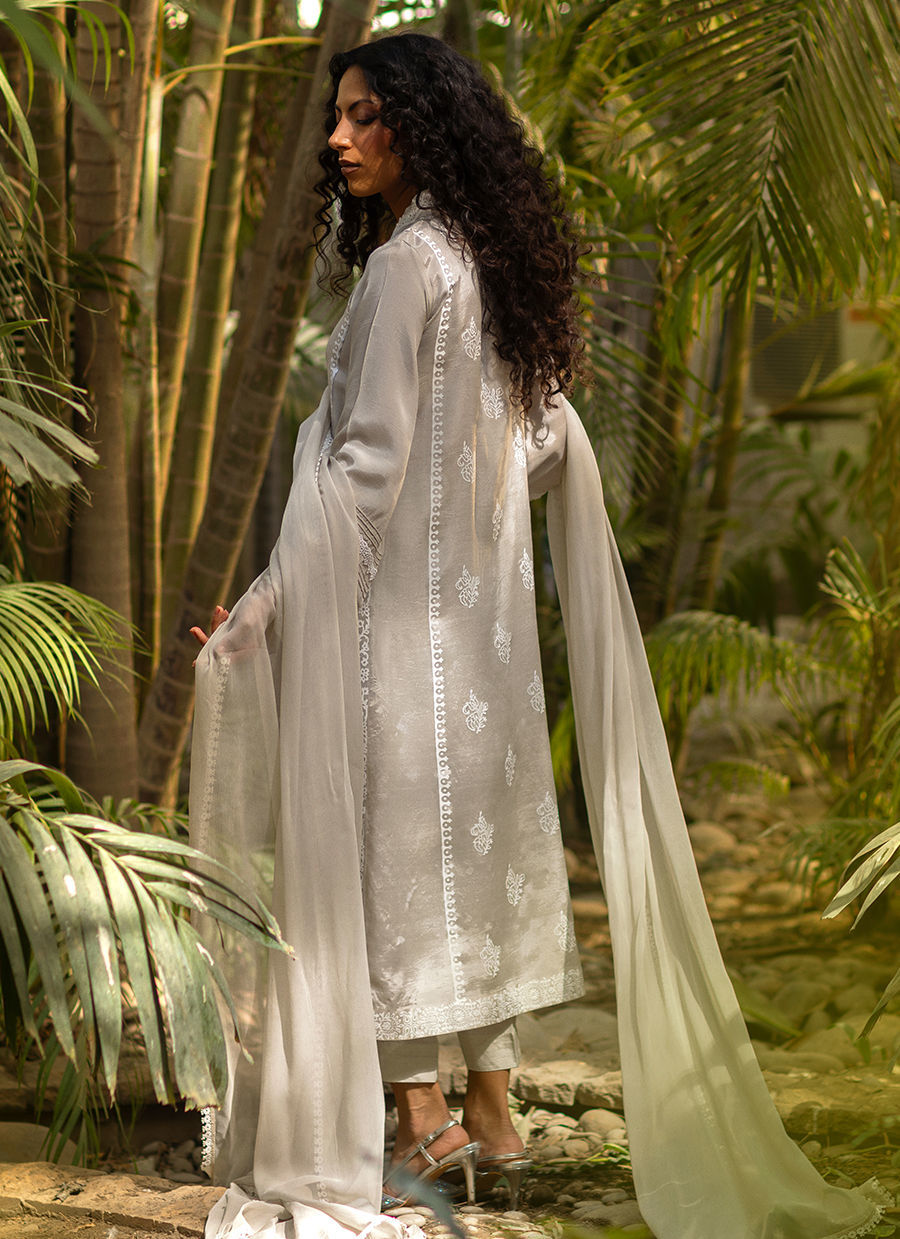 This sophisticated smoke grey silk shirt is elevated with subtle block print detailing across the shirt, creating a perfect balance of tradition and modern elegance. The hem is beautifully enhanced with an embroidered white crochet-style appliqué, adding delicate texture and artisanal charm. The sleeves feature refined pintuck detailing, finished with an intricate Schiffli border for a graceful finish. Minimal gota accents complete the shirt with understated shimmer. Paired with a complimentary dupatta and matching pants, this ensemble is an effortless choice for refined day-to-evening wear.