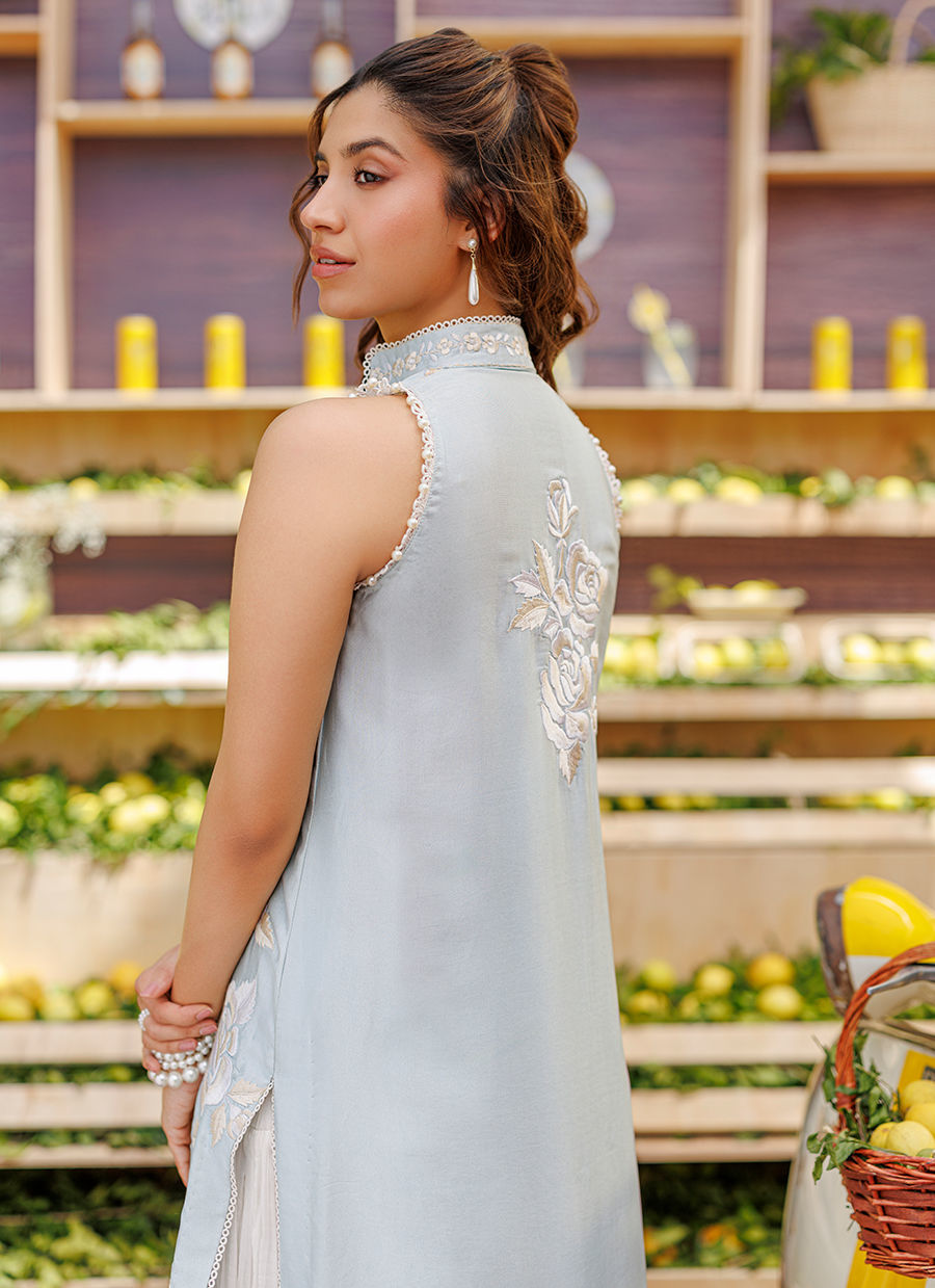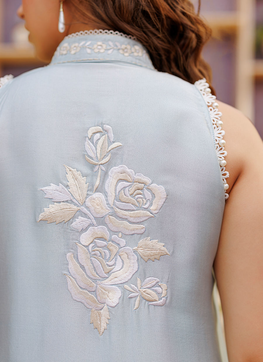 This elegant long-line jacket in ice blue sheesha silk features a sophisticated halter silhouette, adorned with exquisite ivory rose gara embroidery. Detailed with delicate pearl floral buttons, the piece is paired with ivory crushed medium silk dhaka pants for a luxurious textural contrast that is both timeless and ethereal.
