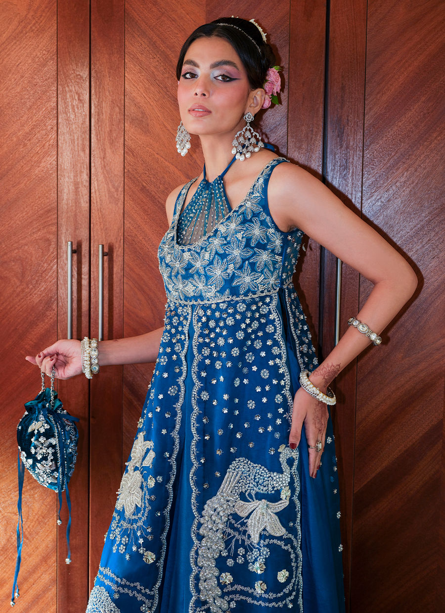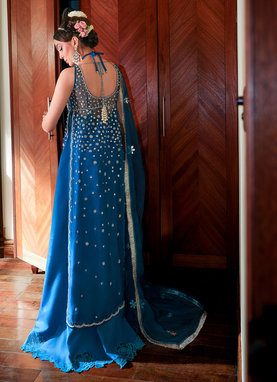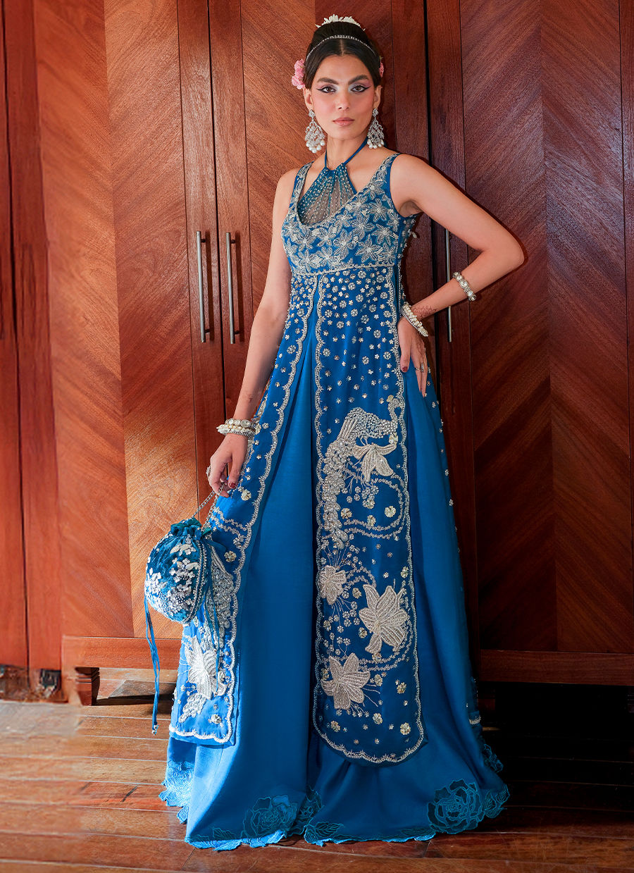 Includes: Shirt with dress Roohi is a statement of ethereal charm, featuring a sleeveless front-slit organza shirt with a delicately embellished floral bodice, peacock motifs, Swarovski accents, and scalloped edgings. Beneath lies a graceful underdress with a flared Thai silk lehnga, layered with a gathered net bodice for added volume and allure. The look is completed with an organza dupatta adorned with kiran pati and 3D floral leather motifs, bringing depth and sophistication to this dreamy ensemble.