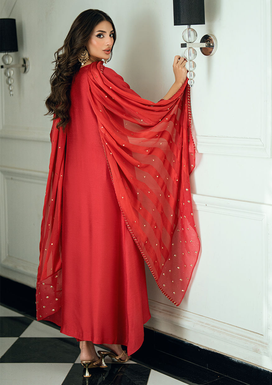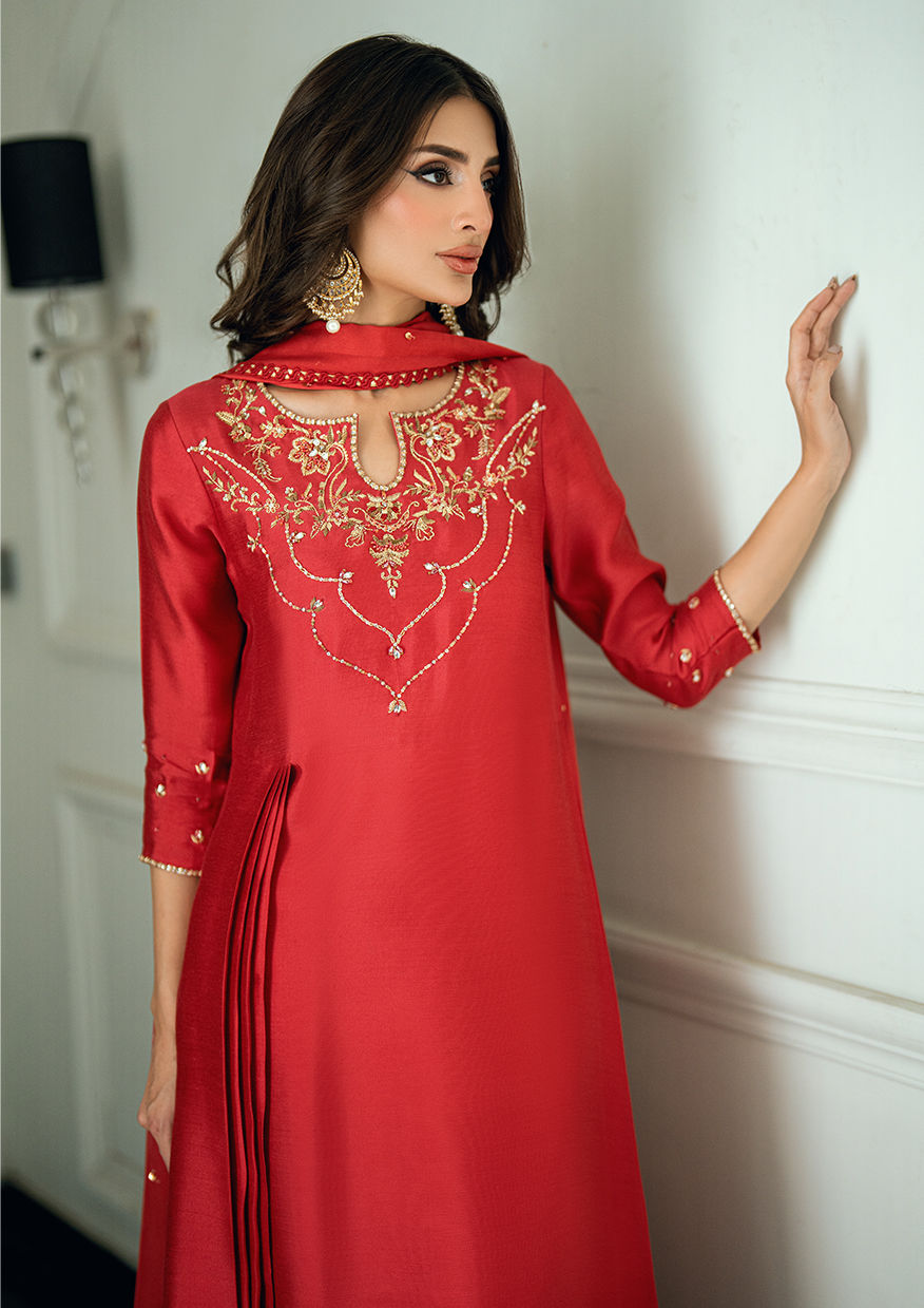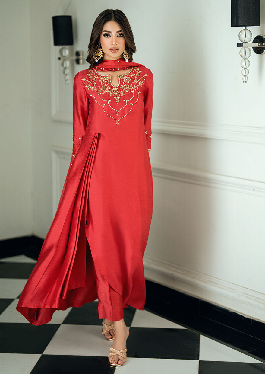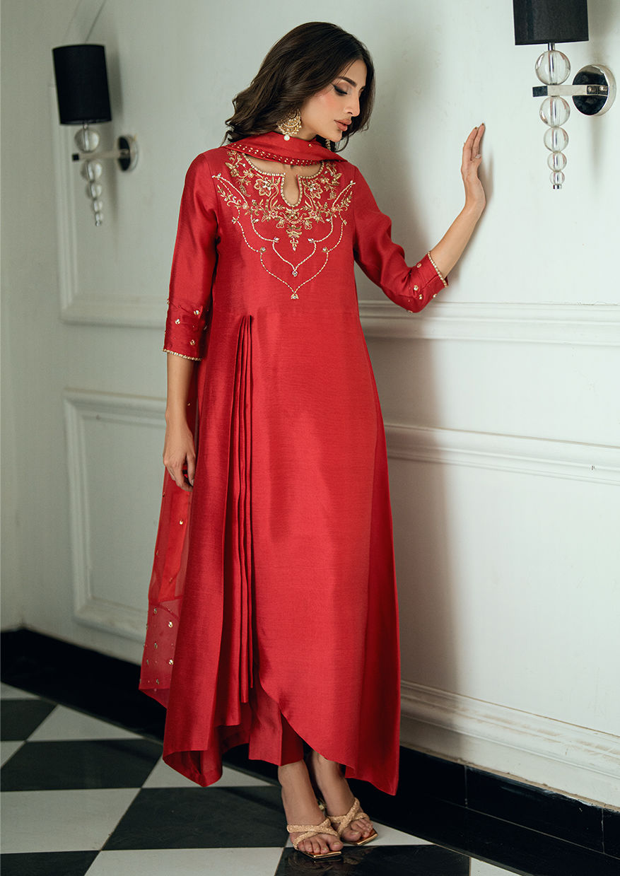 Berry pink silk long asymmetric shirt with handwork on the neckline and sleeves, paired with matching pants and a chiffon-silk chan dupatta — soft, feminine, and effortlessly elevated.