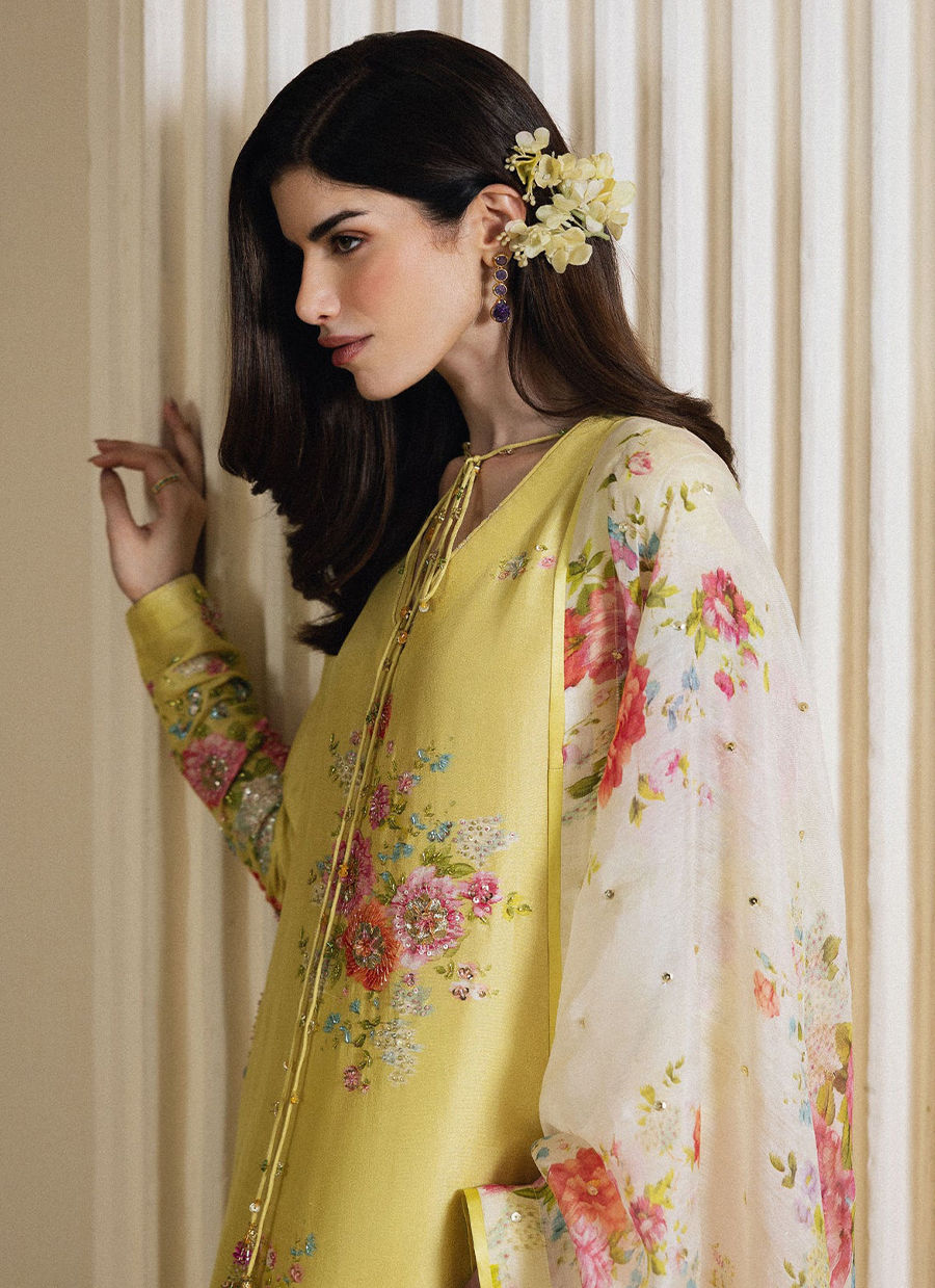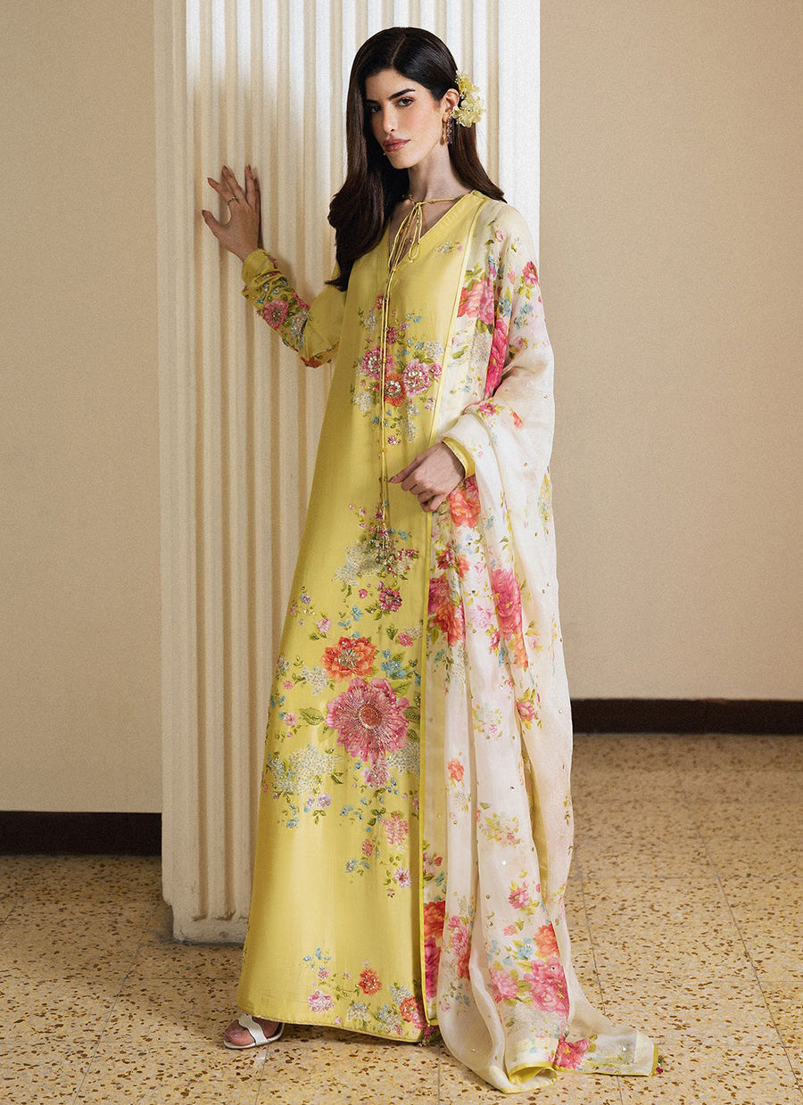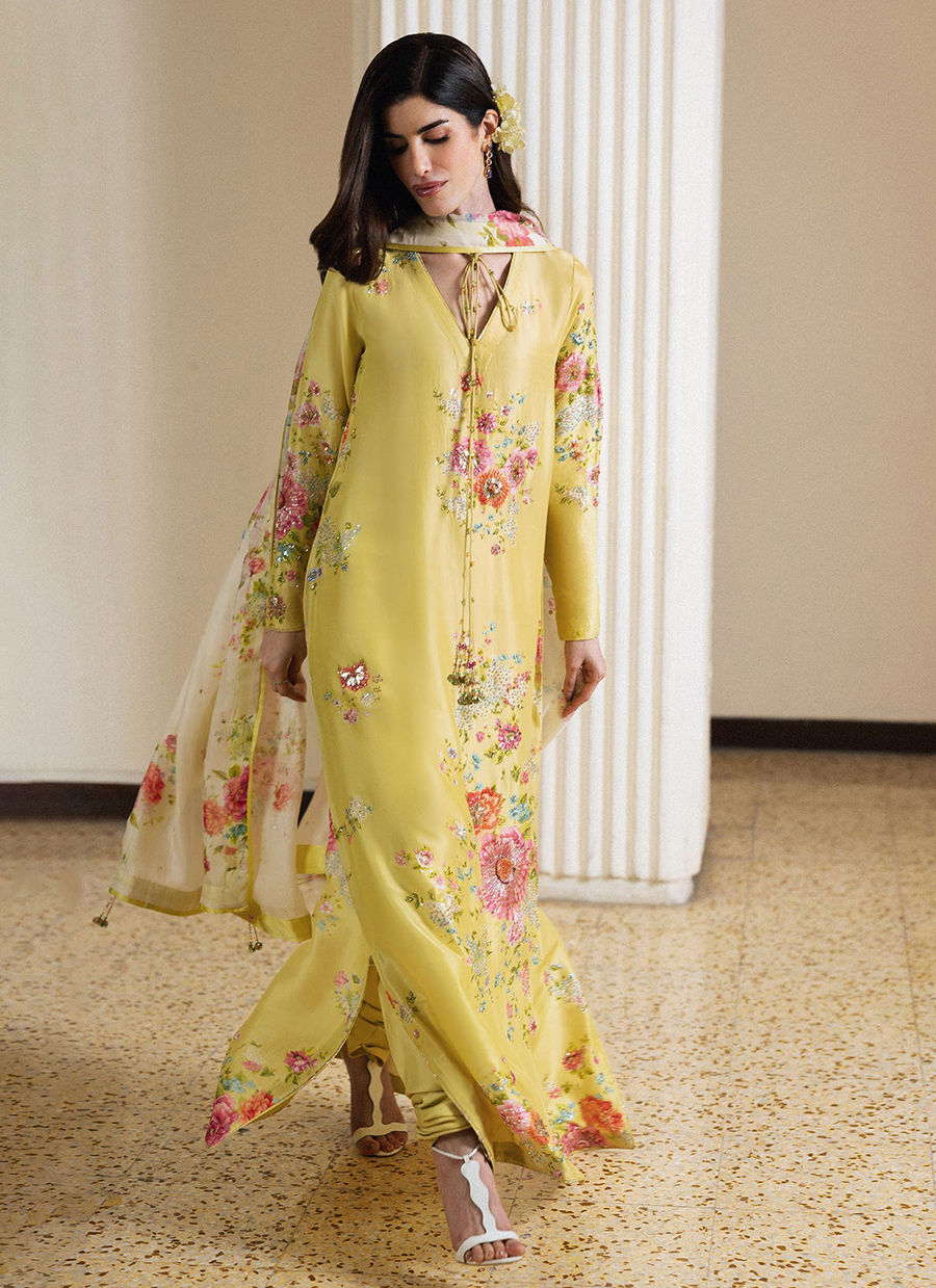 The dress features a straight, floor-length silhouette with a smooth and lightweight raw silk fabric that gives it an elegant and graceful fall. Delicate floral embroidery in shades of pink, coral, blue, and green is scattered across the front, creating a fresh and vibrant look. The neckline has a subtle slit with decorative tassel ties, adding a refined and feminine touch. The dupatta is made from an organza lightweight fabric and is beautifully printed with large floral patterns in coordinating pastel tones. It drapes softly over the shoulder, adding movement and enhancing the outfit’s airy, spring-inspired feel.