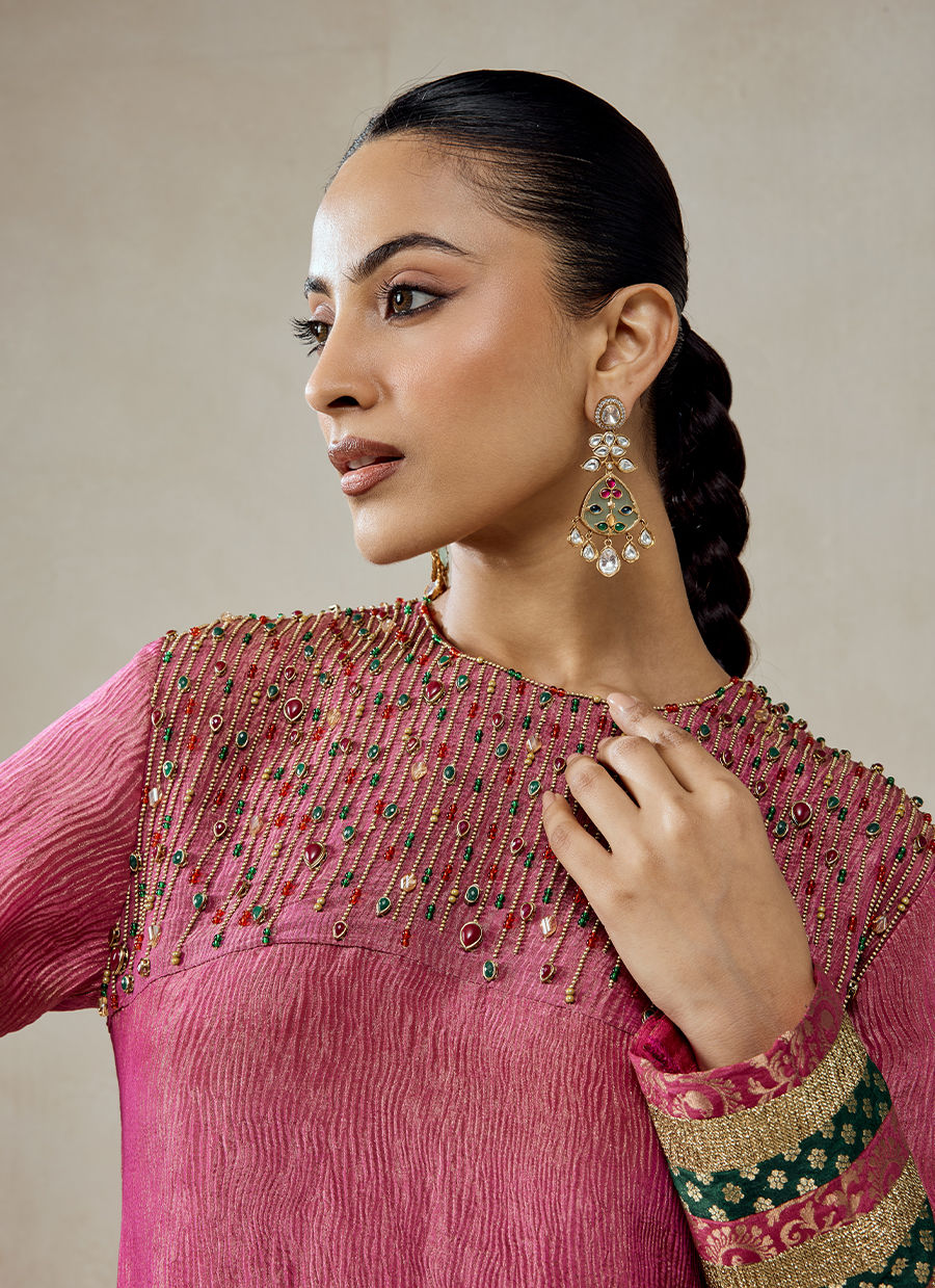 A graceful two-piece kurta set that blends textured elegance with heritage detailing, crafted in a luxurious combination of crushed tissue, Banarasi silk, and shantoon. The kurta is highlighted by A densely embellished yoke, featuring fine beadwork and delicate embroidery that creates a statement focal point. A subtle textured surface from the crushed tissue, adding dimension without heaviness. The sleeves are finished with Banarasi silk cuff panels, detailed with intricate woven motifs in green and gold. The pants feature Scattered small motifs across the fabric, maintaining visual continuity. A coordinated Banarasi border at the hem, tying the entire look together.