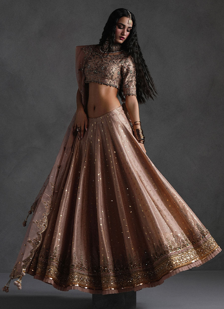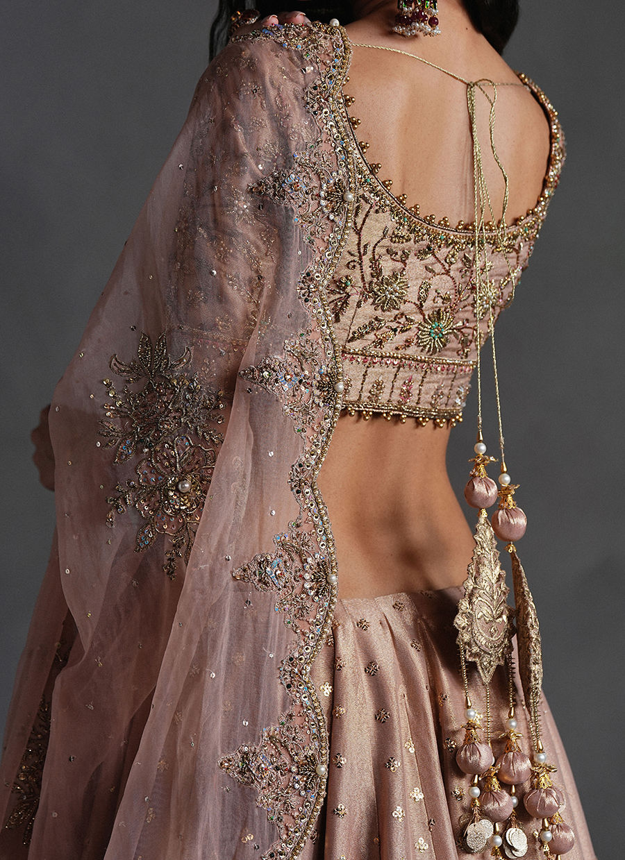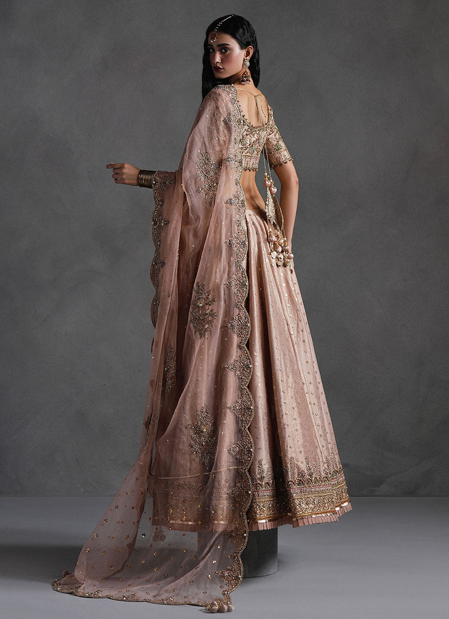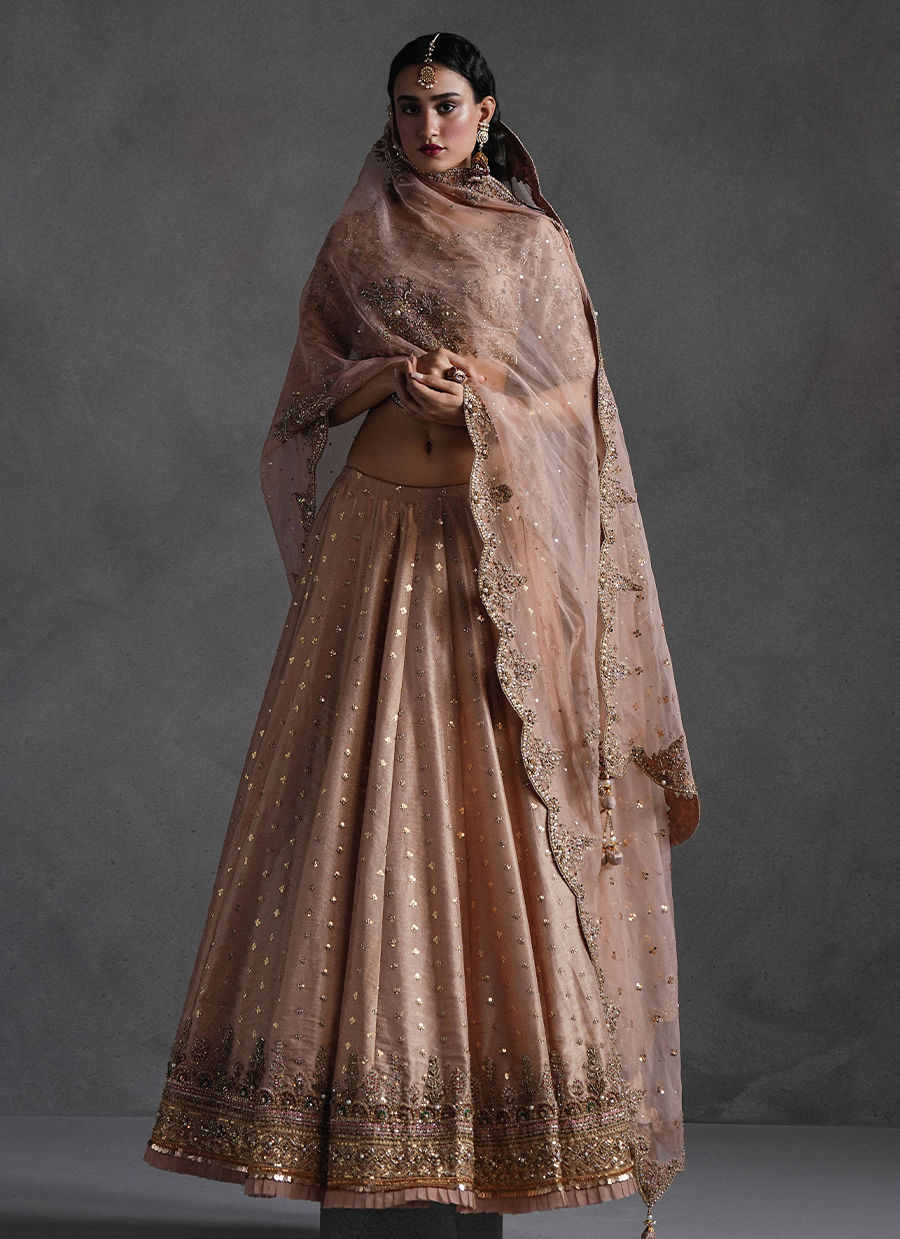 Rose pink lehnga choli is a rhapsody in festive pink, it is a lehenga choli drenched in resplendent zardozi, resham embroidery, and glistening gota work. The sweeping floral vines across the lehenga and the heavily ornamented choli conjure the opulence of a Mughal garden in full bloom. A matching dupatta, equally alive with embroidered scrolls, is edged with gota and playful kiran trims, completing a look that feels celebratory, and irresistibly romantic.
