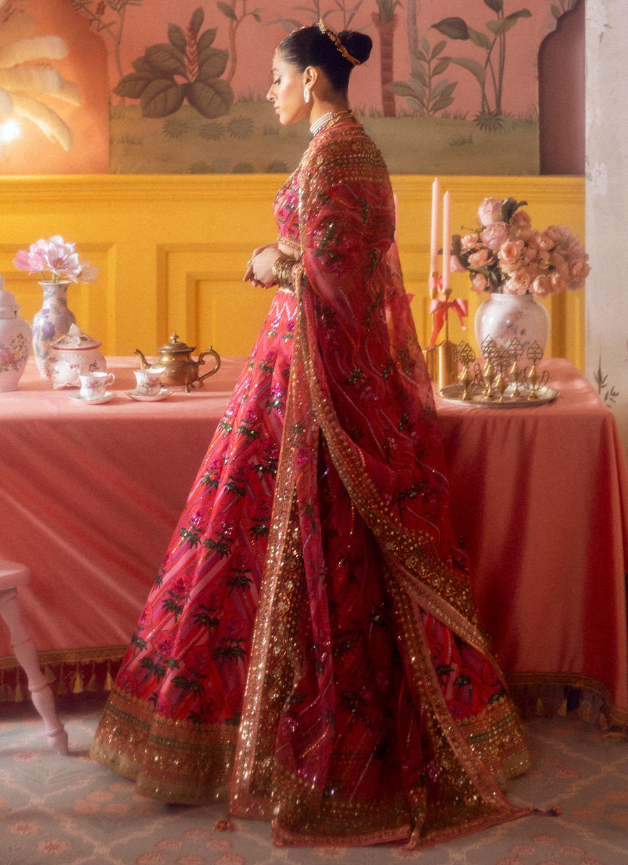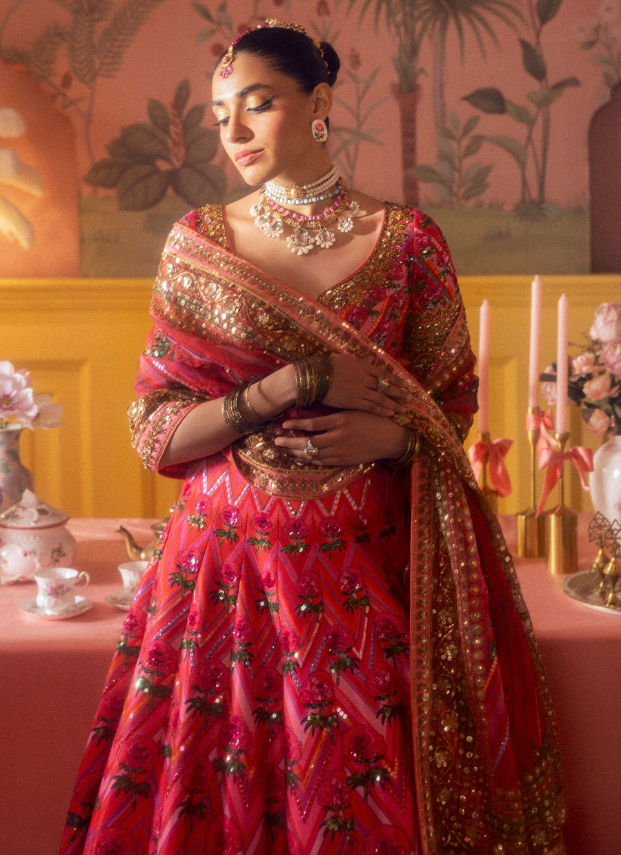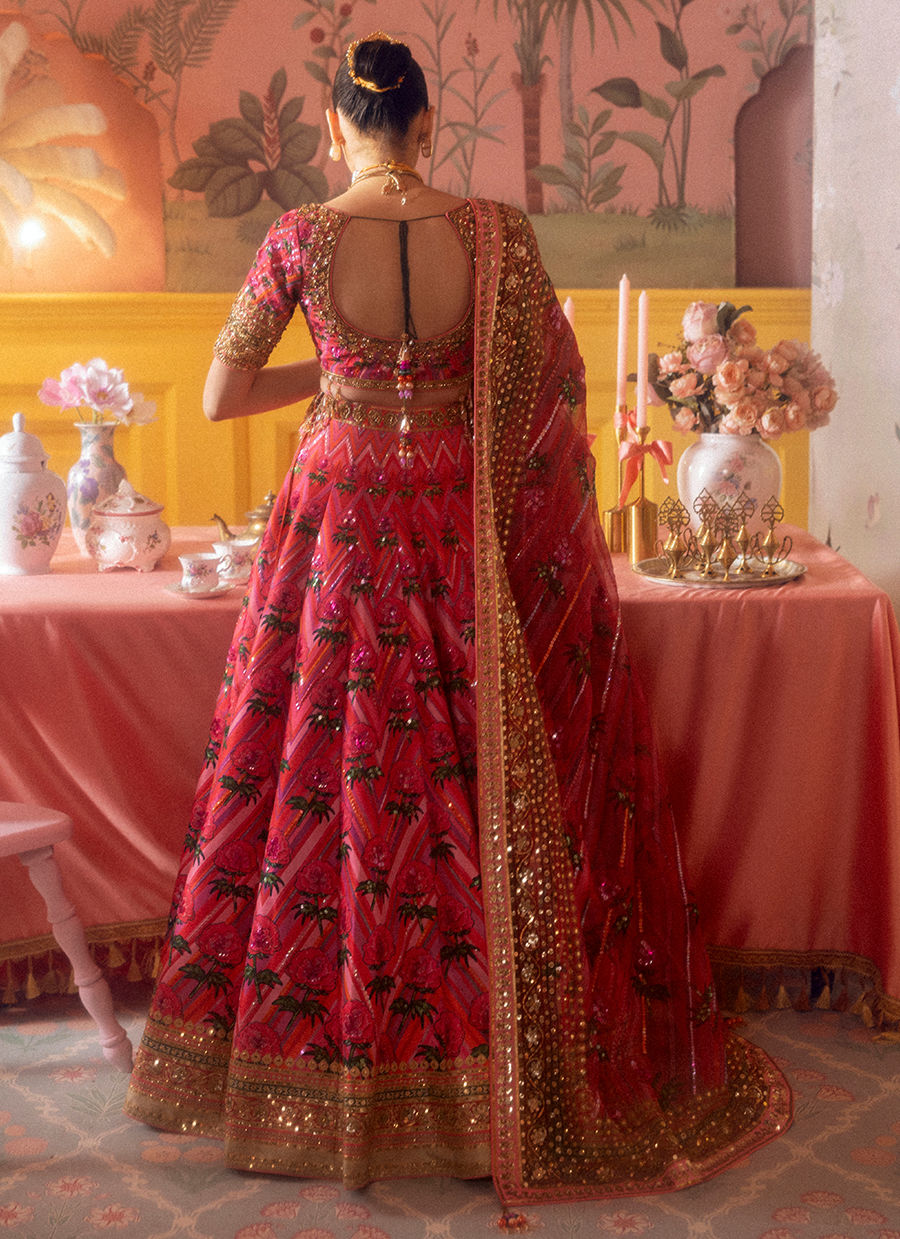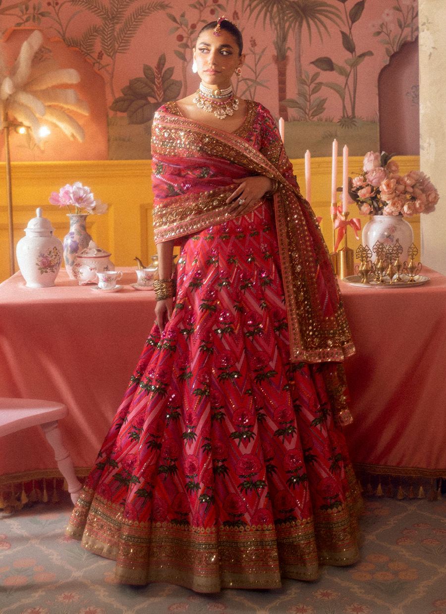 Shocking pink chevron and bright roses make this contemporary lehnga choli a striking number, with its matching printed organza dupatta to complete the look.