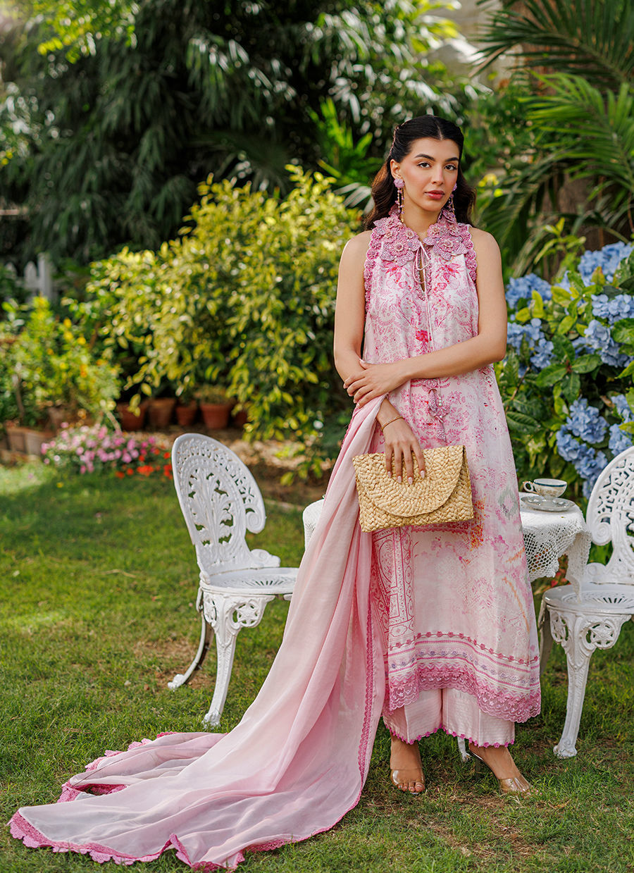 A striking halter sleeveless long shirt designed to make a bold statement, featuring intricately crafted 3D floral embellishments along the armholes and an exaggerated collar adorned with delicate floral and embellished details for added drama. It is paired with a powder pink sheesha silk izaar and complemented by a ombre medium silk dupatta. *Model is 5'5" and is wearing a size extra small.