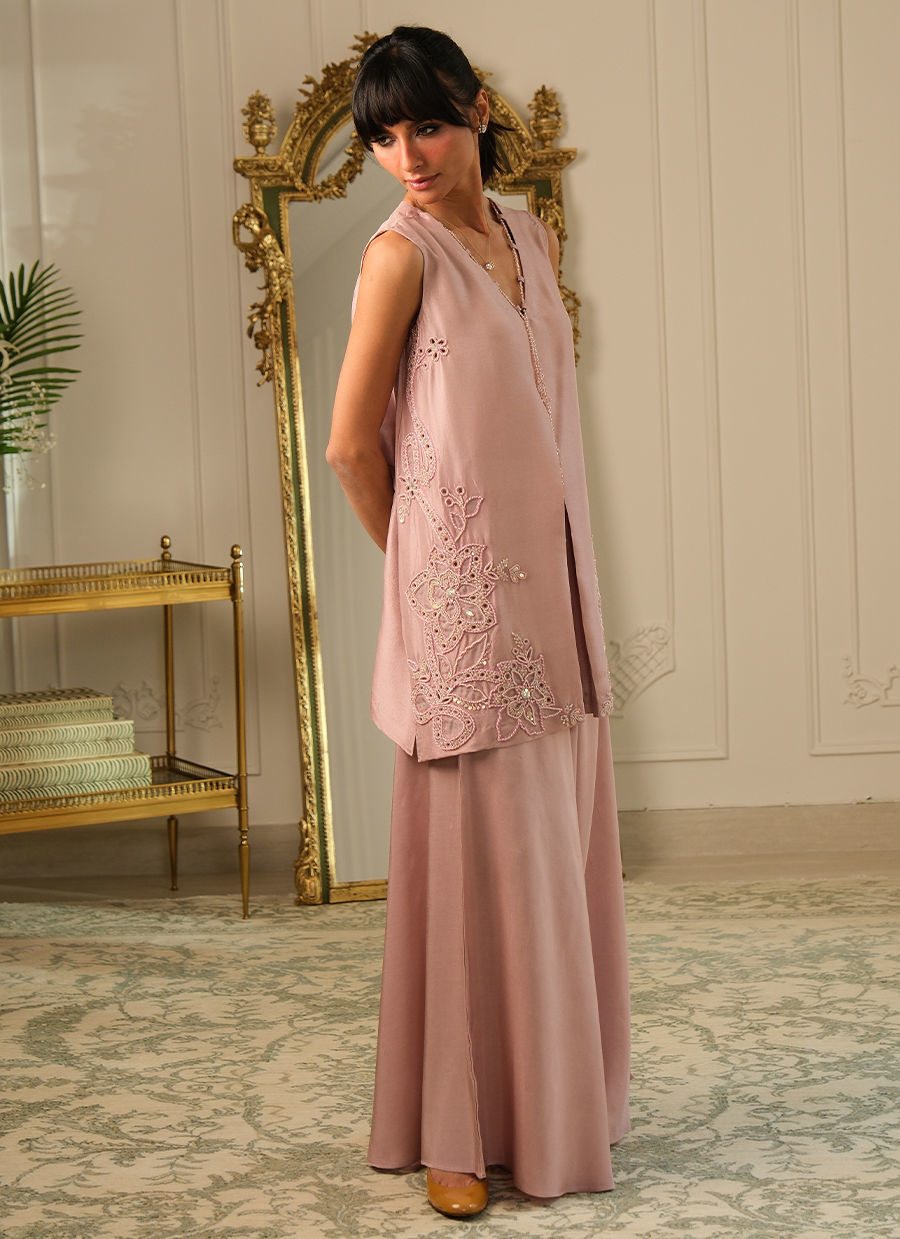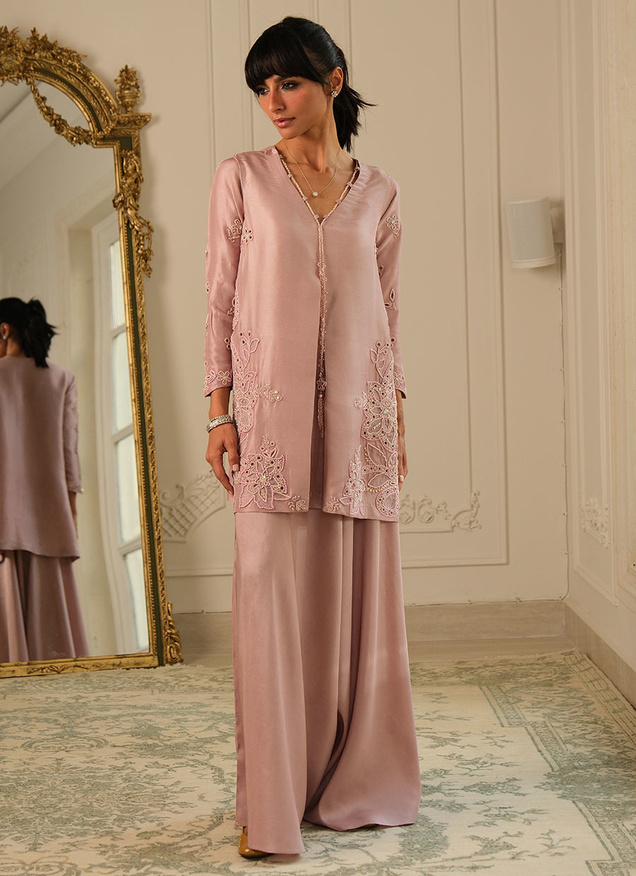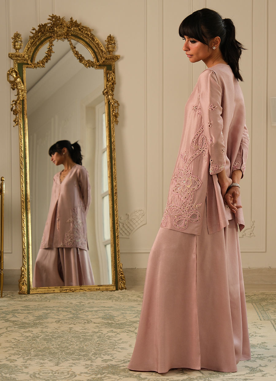 Cut in this season’s most flattering silhouette, Roselle showcases delicate hand embroidery on fine silk, using the tiniest of pearls and intricate cutwork, carefully placed to create texture and depth without heaviness. A crystal-tasselled neckline adds subtle shimmer. The shirt is paired with skirt pants and an embroidered organza dupatta. Refined yet effortless, Roselle is designed for intimate occasions where elegance, detail, and femininity take centre stage.
