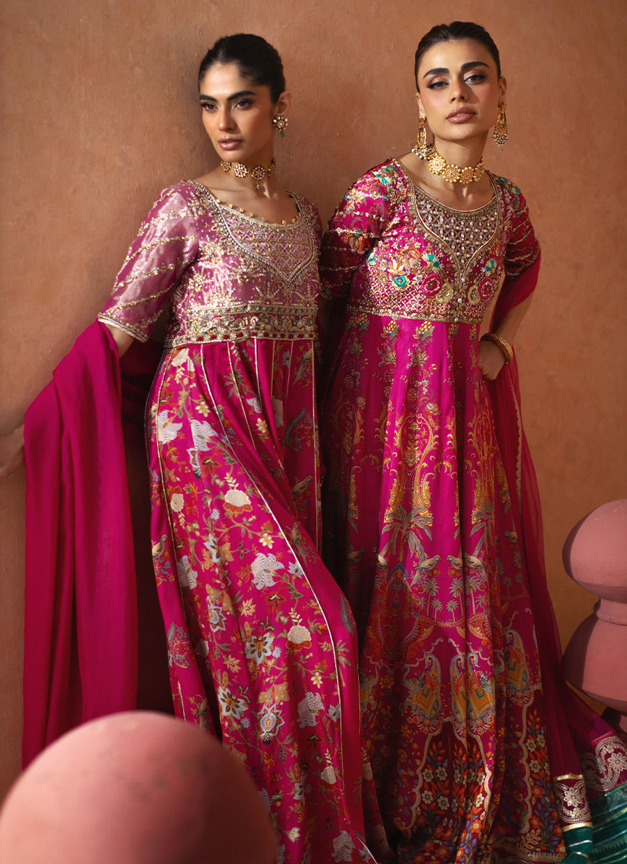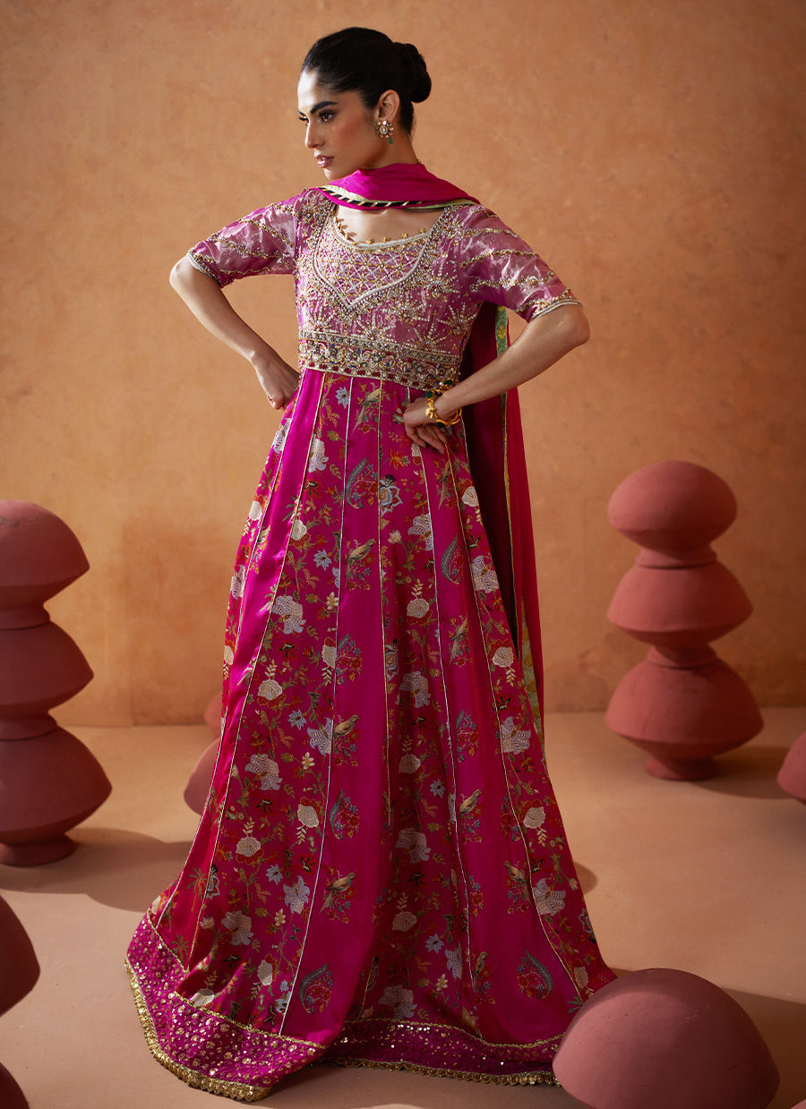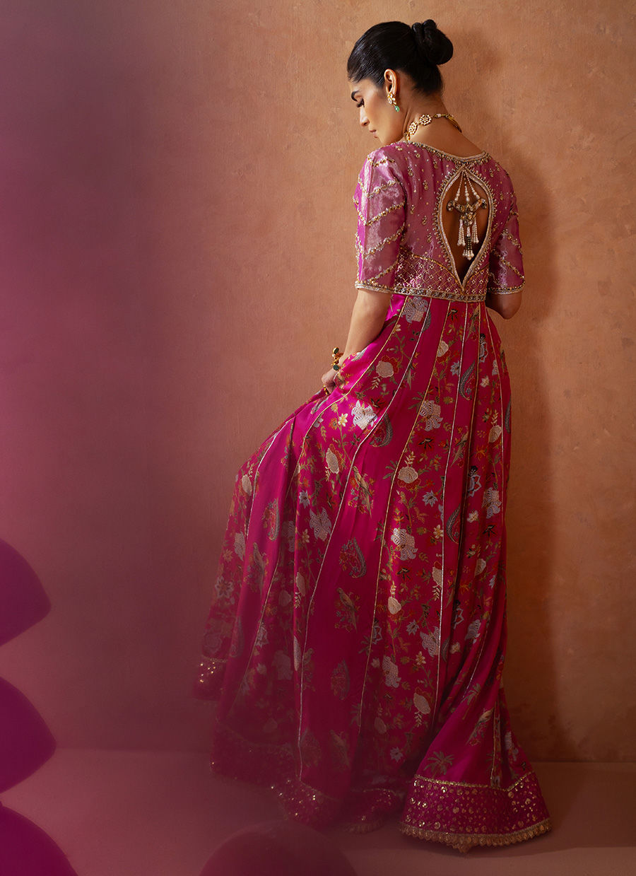 This floor-length pishwas is presented in an exquisite festive pink hue, showcasing a floral embroidered panel complemented by intricate gota embellishments. The lamé bodice has been meticulously designed with elaborate zardozi details. The center back of the bodice is adorned with handcrafted dangling tassels, adding to its elegance. The hem features a carefully curated border of light-catching sequins. The ensemble is completed with an ombré silk dupatta and straight raw silk pants, offering a sophisticated finish to the overall look.