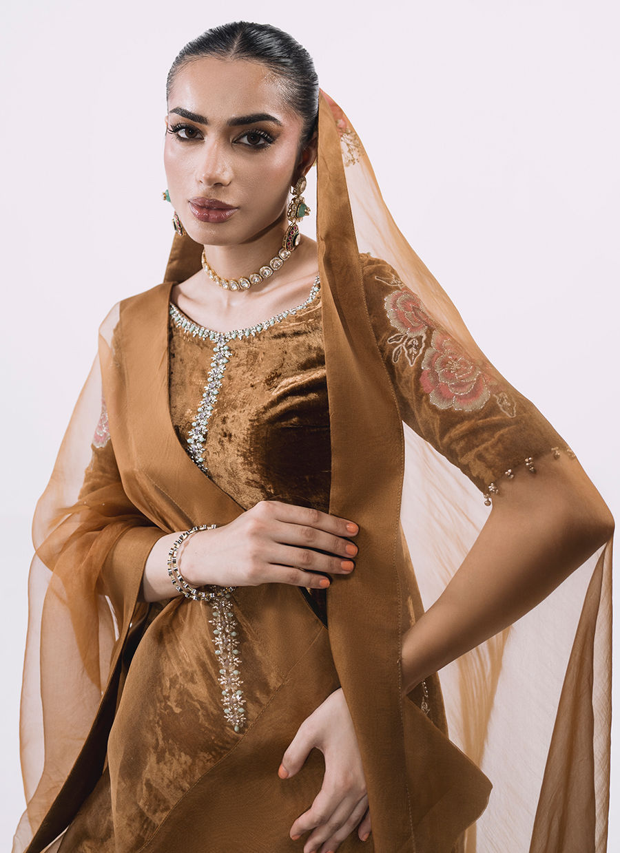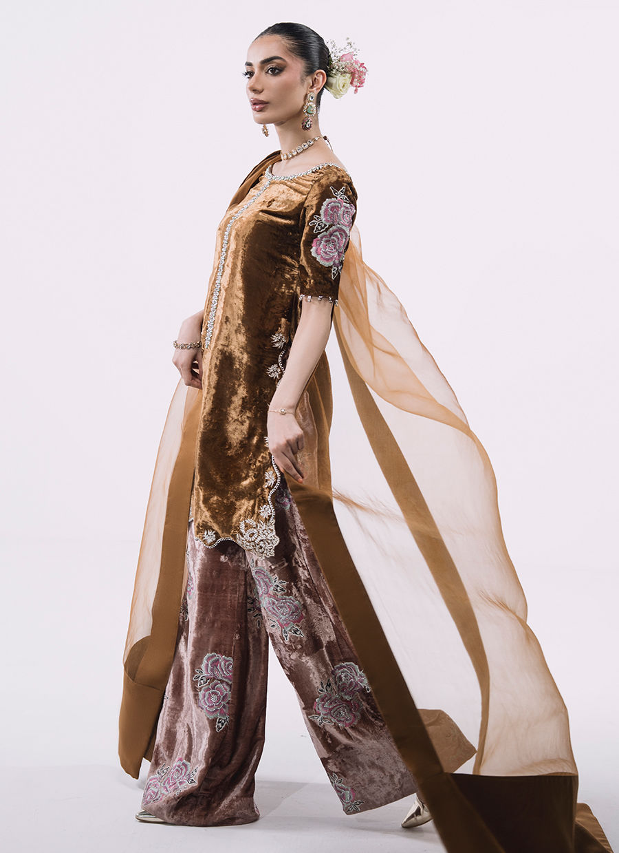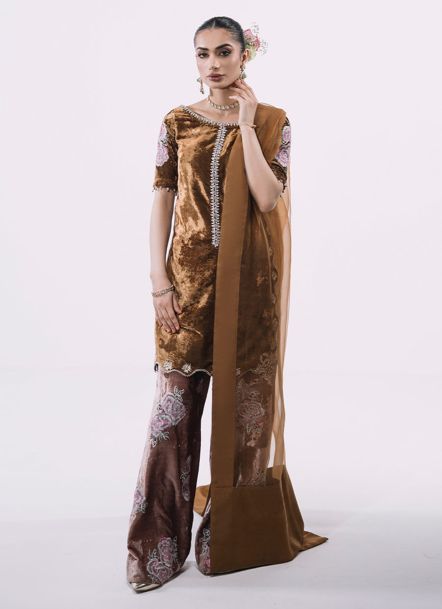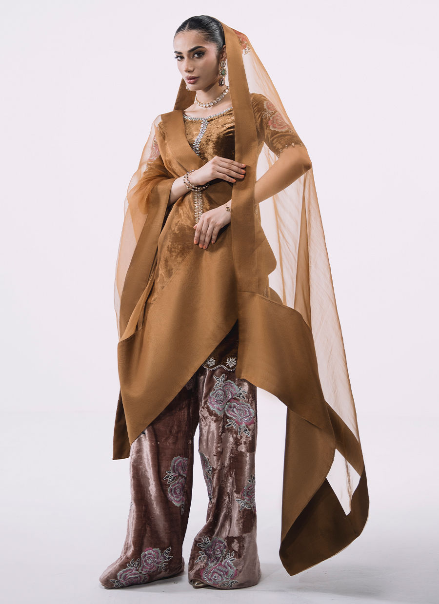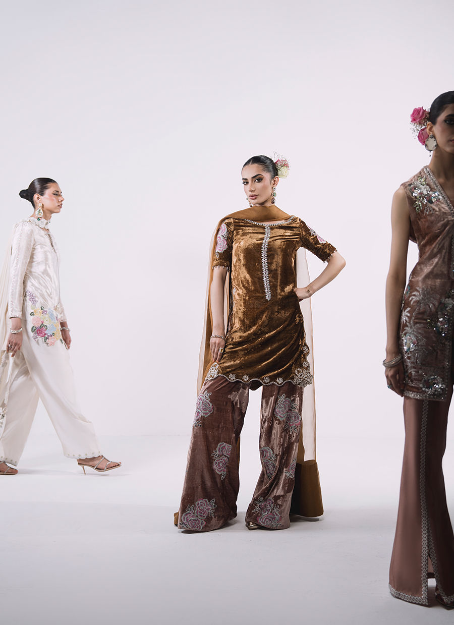 Includes: Shirt with trouser A chic boat-neck mid-thigh shirt featuring half sleeves, adorned with embroidered scalloped daaman and delicate floral sleeve motifs, enhanced by an embellished neckline for refined sparkle. Paired with contrast flared-fit velvet trousers showcasing embroidered florals on the front and back for a luxe touch. Completed with an organza dupatta finished with graceful borders, offering a perfect balance of sophistication and contemporary charm.