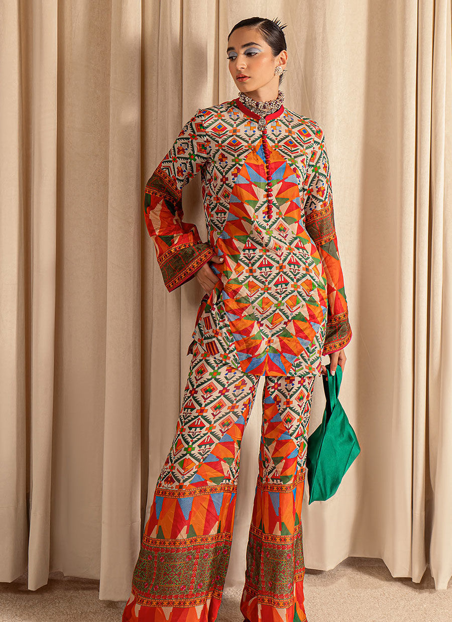 A classy tribal printed co-ord set that has phenomenal details of red satin on the hem and edges of the shirt, sleeves as well as the palazzo pants.