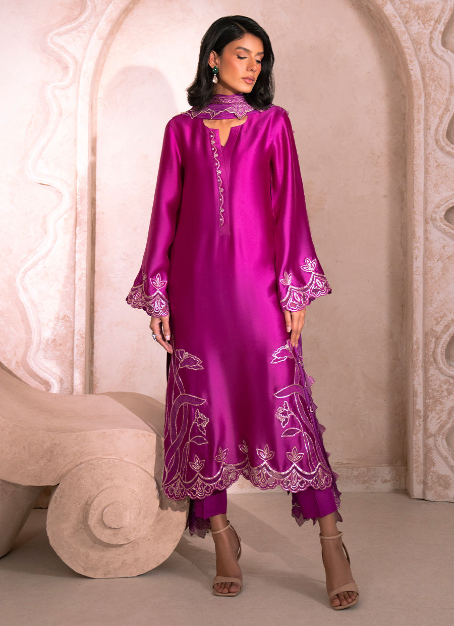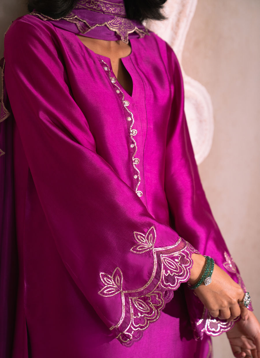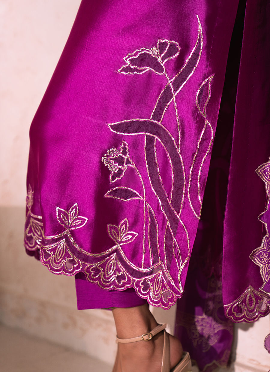 A statement of refined opulence, this exquisite ensemble is crafted in a rich fandango-hued silk. The long silk shirt features a classic kurta-cut neckline, lavishly adorned with royal golden pitta embellishments that lend a regal allure. The shirt hem is beautifully enhanced with intricate cutwork, delicately filled with pure organza and finished with fine royal golden pitta outlining. The sleeves are elegantly detailed with embellished hems, adding depth and artisanal charm to the silhouette. Paired with a matching silk trouser, the ensemble is completed with a luxurious silk dupatta, enriched with subtle golden block printing for a timeless, heritage-inspired finish. A sophisticated creation designed for those who seek understated grandeur and impeccable craftsmanship.