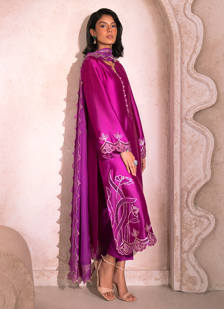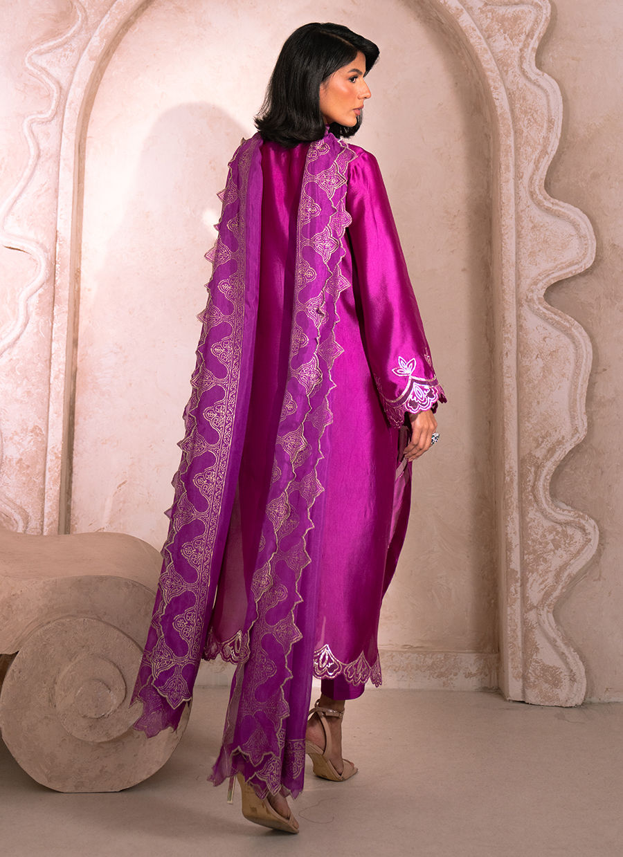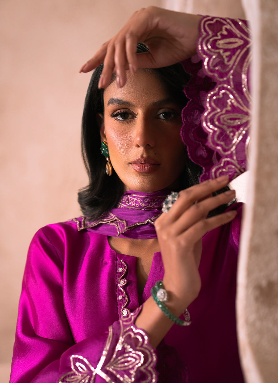 A statement of refined opulence, this exquisite ensemble is crafted in a rich fandango-hued silk. The long silk shirt features a classic kurta-cut neckline, lavishly adorned with royal golden pitta embellishments that lend a regal allure. The shirt hem is beautifully enhanced with intricate cutwork, delicately filled with pure organza and finished with fine royal golden pitta outlining. The sleeves are elegantly detailed with embellished hems, adding depth and artisanal charm to the silhouette. Paired with a matching silk trouser, the ensemble is completed with a luxurious silk dupatta, enriched with subtle golden block printing for a timeless, heritage-inspired finish. A sophisticated creation designed for those who seek understated grandeur and impeccable craftsmanship.