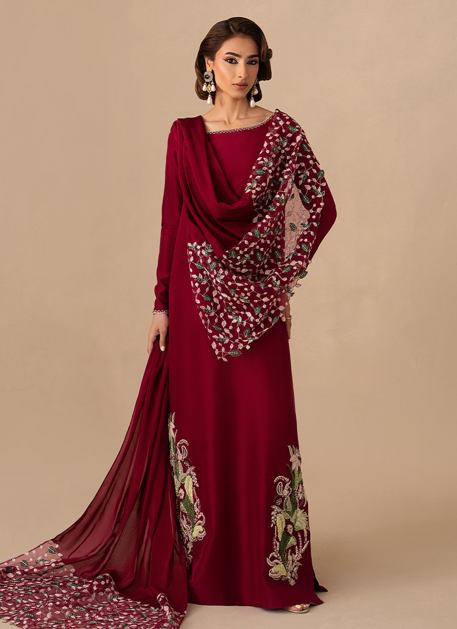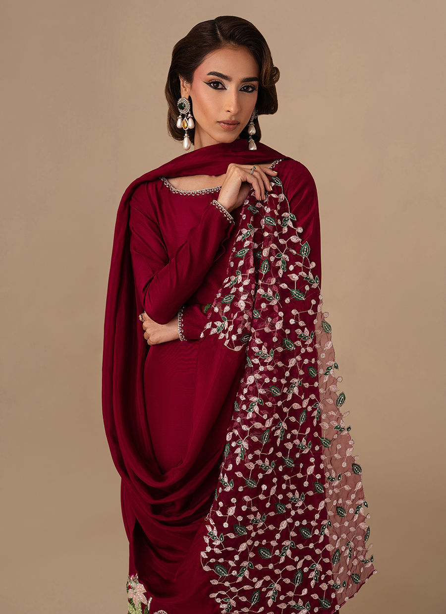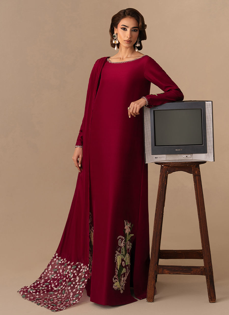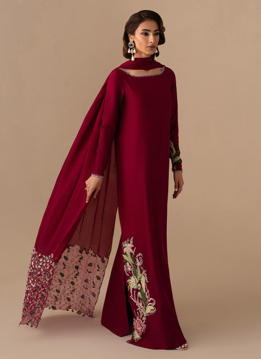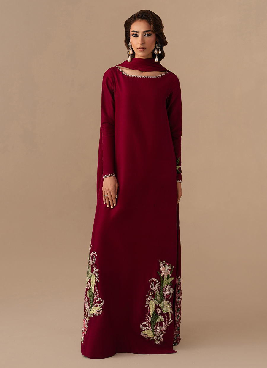 The Pure Raw Silk/Korean Raw Silk  long shirt is elevated with hand embellishment on the neckline and a single embellished sleeve, paired with straight trousers and a medium silk dupatta finished with machine-embroidered borders.