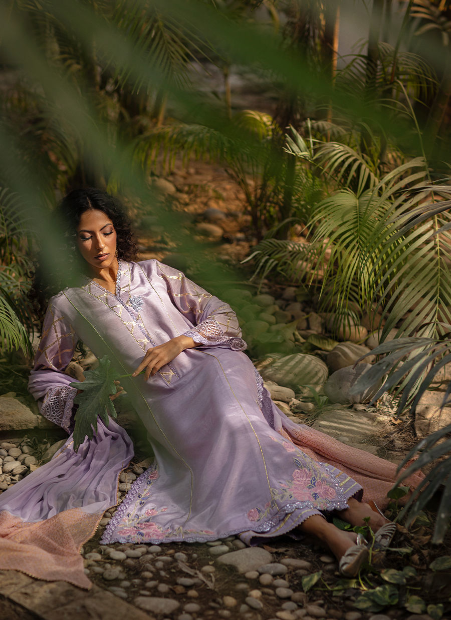 A flowing silhouette shirt in a soft lavender hue, crafted from luxurious silk and adorned with delicate appliqué floral detailing along the hem. The neckline is refined with subtle Lurex accents and elevated with intricately crafted silver zari rosettes. The ensemble is completed with a complimentary ombre chiffon dupatta and a coordinating izaar, finished with graceful gota accents for a refined, elegant finish.