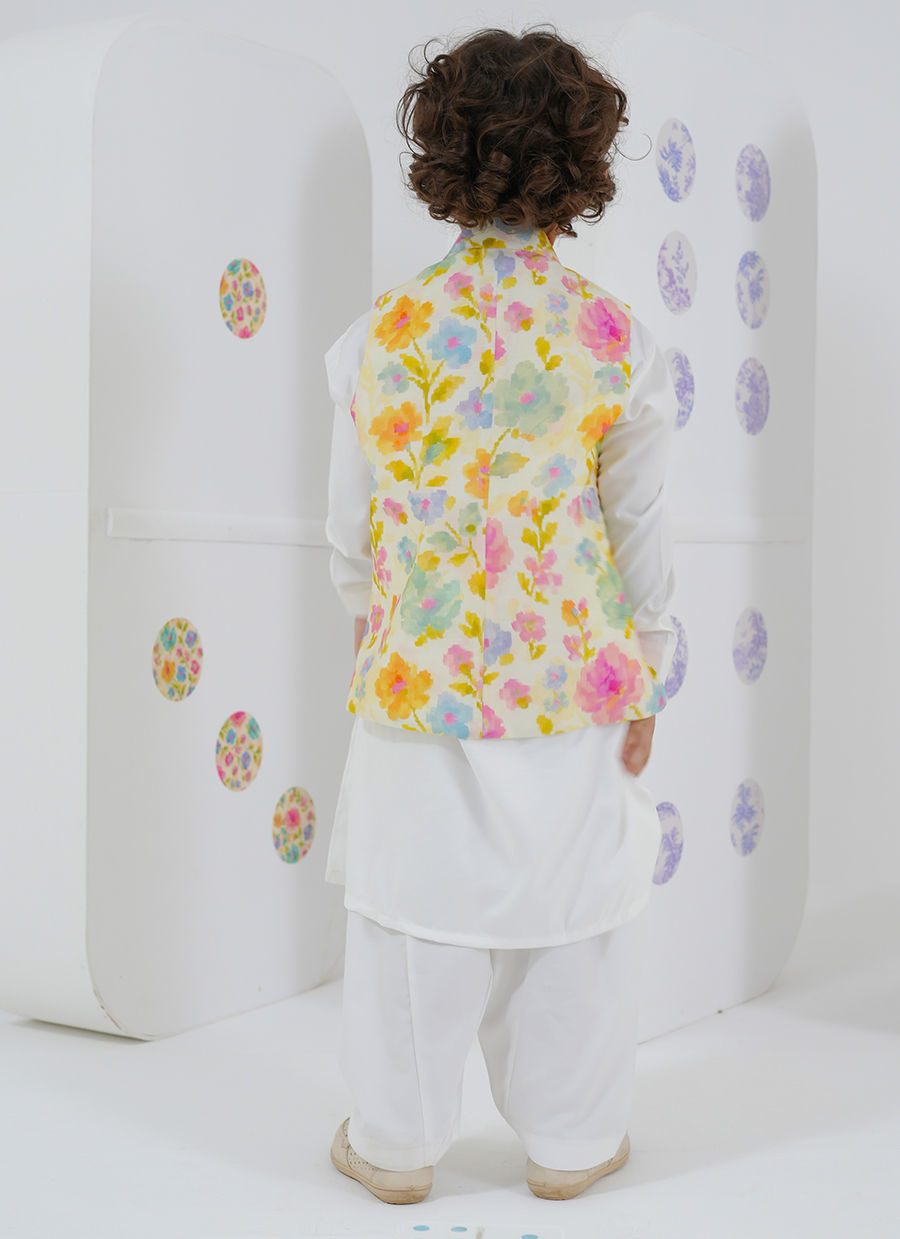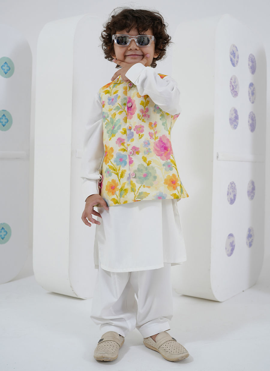 A playful companion to Runa Mini, this boys’ set features a soft floral printed waistcoat layered over a classic kurta. Designed to match while standing out, it brings a fresh and cheerful feel to festive dressing.