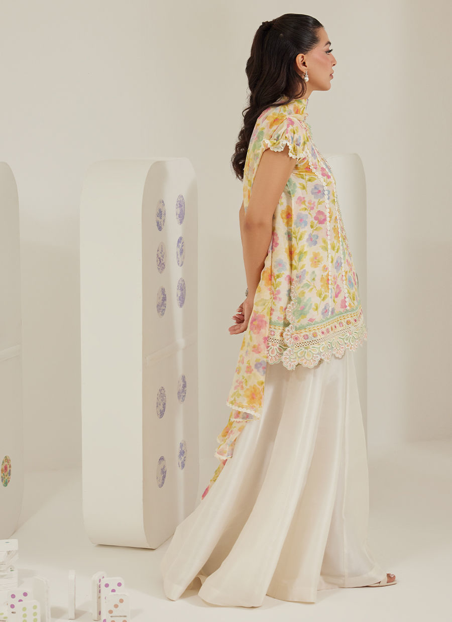 Light, playful, and effortlessly feminine — Runa in its short silhouette brings a fresh take to festive dressing. Crafted in pure raw silk, the shirt is adorned with delicate florals scattered across a soft pastel canvas, creating a look that feels airy, joyful, and refined.