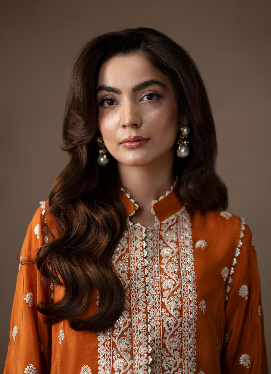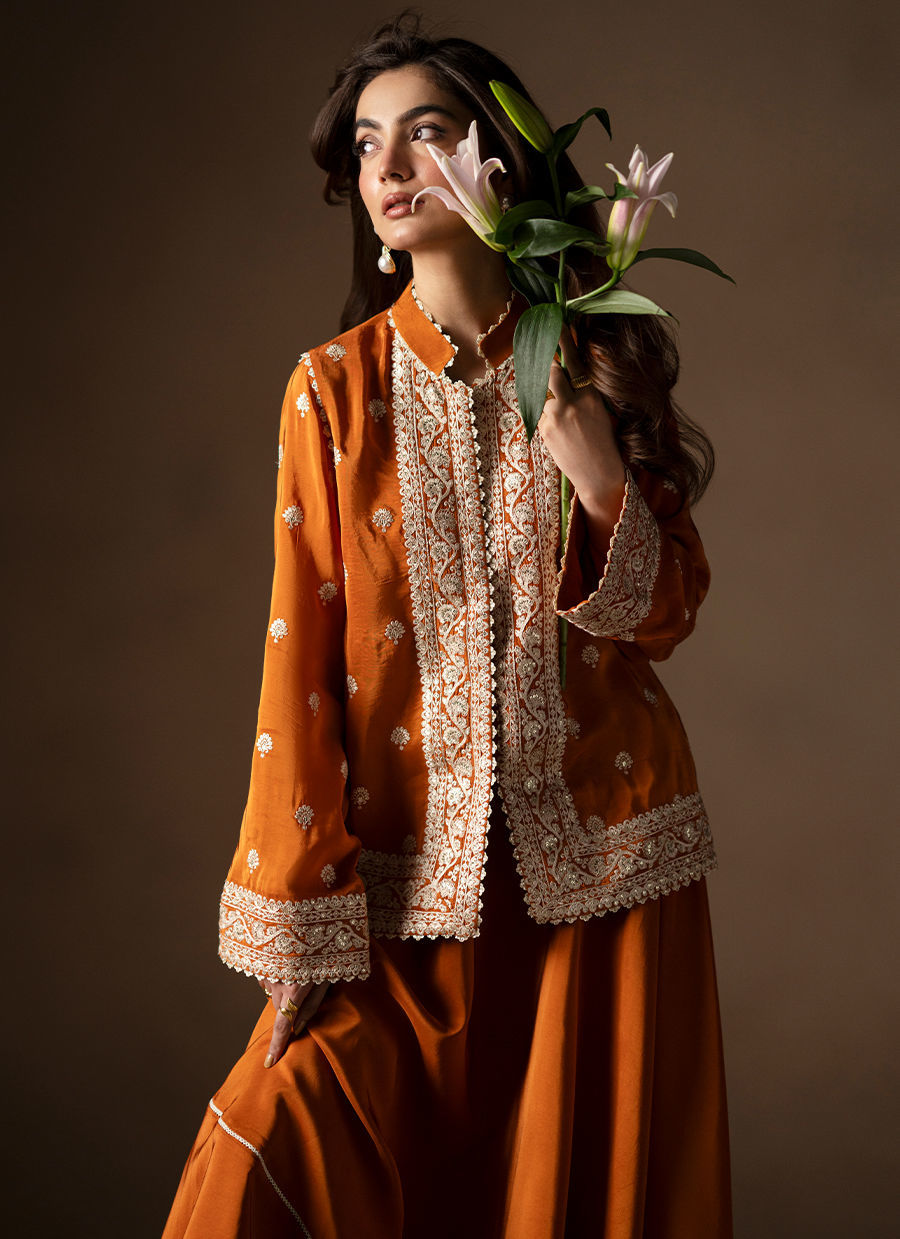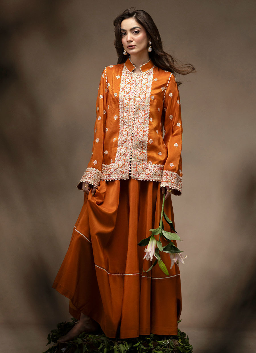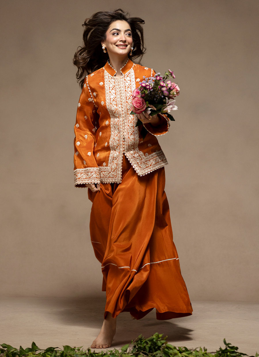 For the days when plans that start with chai and end somewhere fabulous, the Rusha ensemble offers a composed yet breezy silhouette in deep rust. The top, tailored like a softly structured Mao jacket, features intricate white threadwork that runs across the sleeves and front panel with a quiet exactness. A band collar and narrow embroidered borders frame the piece with restraint, while the floor-length skirt flares out gently, its hem echoing the same white embroidery. Together, they make a compelling case for dressing up without ever having to say so.
