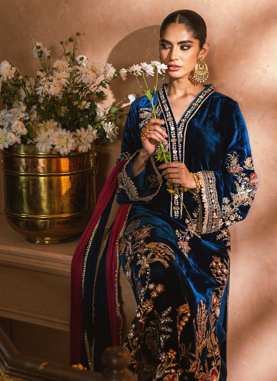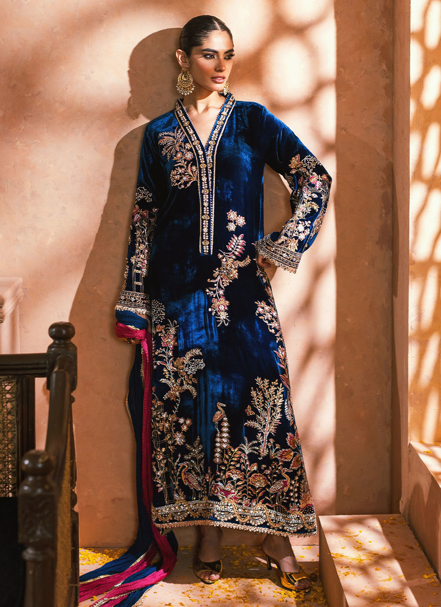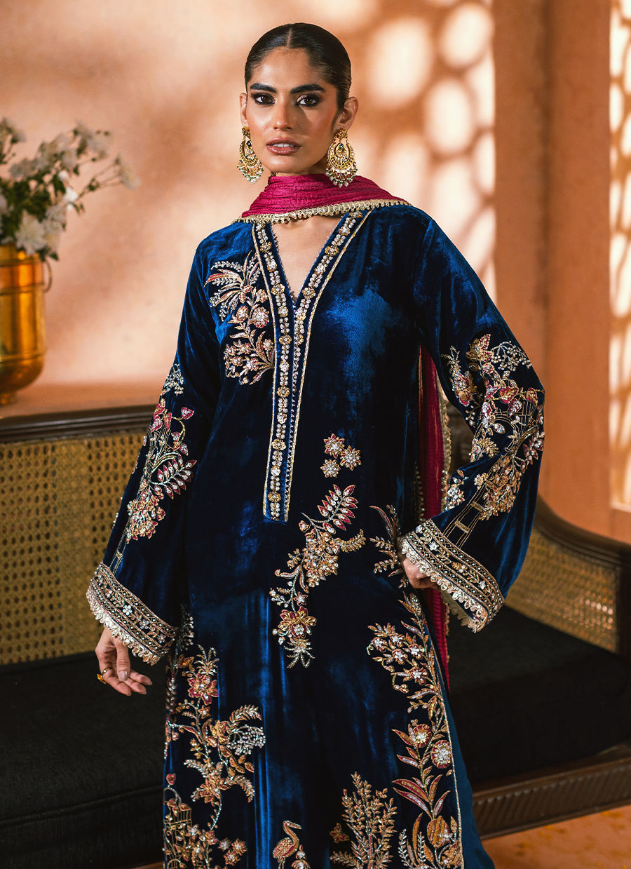 Long silhouette shirt in two-tone velvet, presented in a magnificent lapis blue, showcasing intricate floral and fauna imagery at the center front. The imagery is artfully enhanced with handcrafted zardozi details in silver, gold, and antique finishes, complemented by light-reflecting sequins. This ensemble is accompanied by a color-blocked crushed dupatta and matching raw silk pants, designed to evoke a festive appearance.