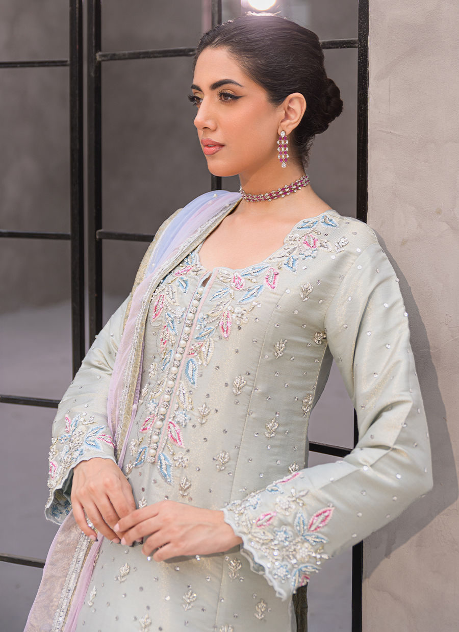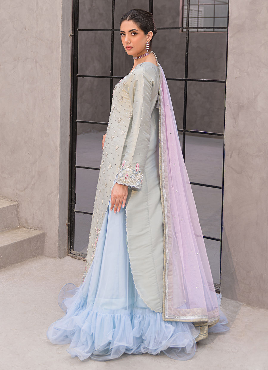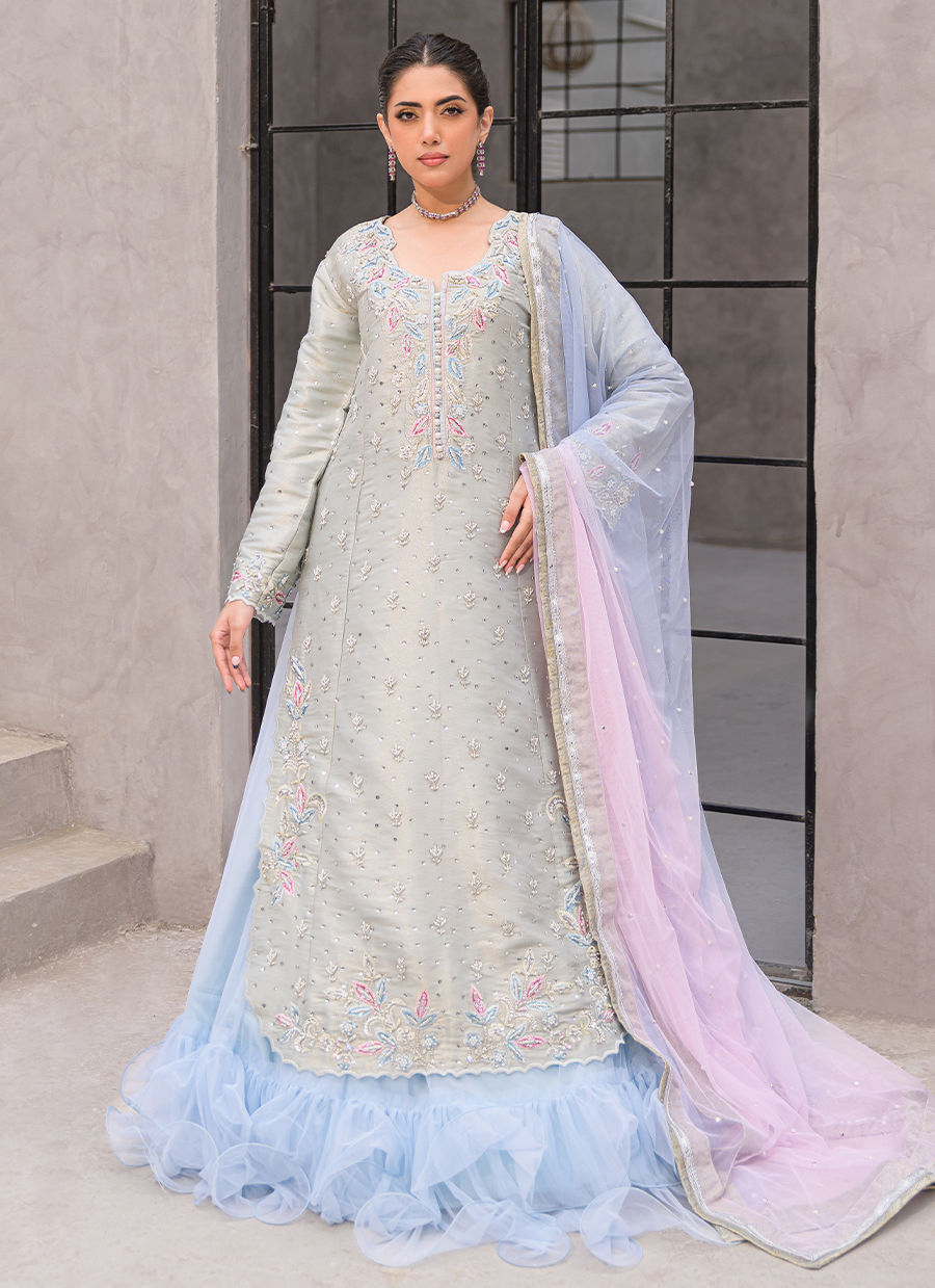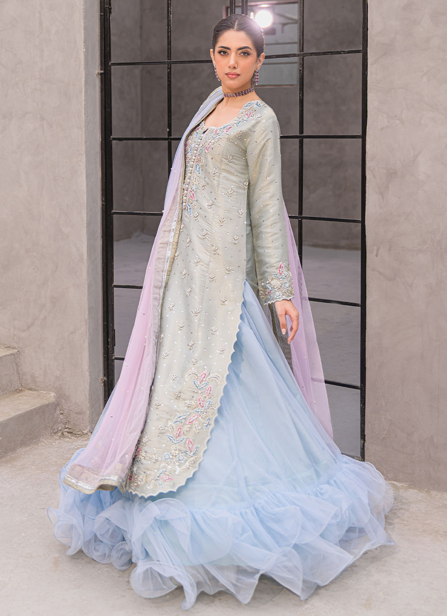 A dreamy powder blue long kameez adorned with delicate pastel embroidery and crystal embellishments, paired with a lilac net dupatta. The outfit is finished with soft ruffled organza edging at the hem, adding movement and charm. Light, ethereal, and graceful, this ensemble is an enchanting choice for day weddings, engagement ceremonies, or elegant festive affairs.