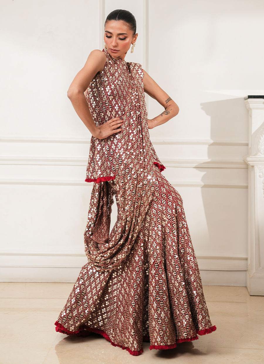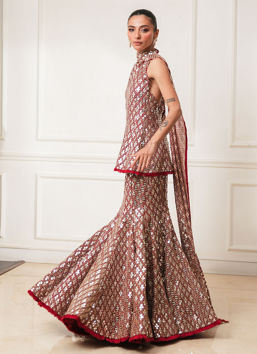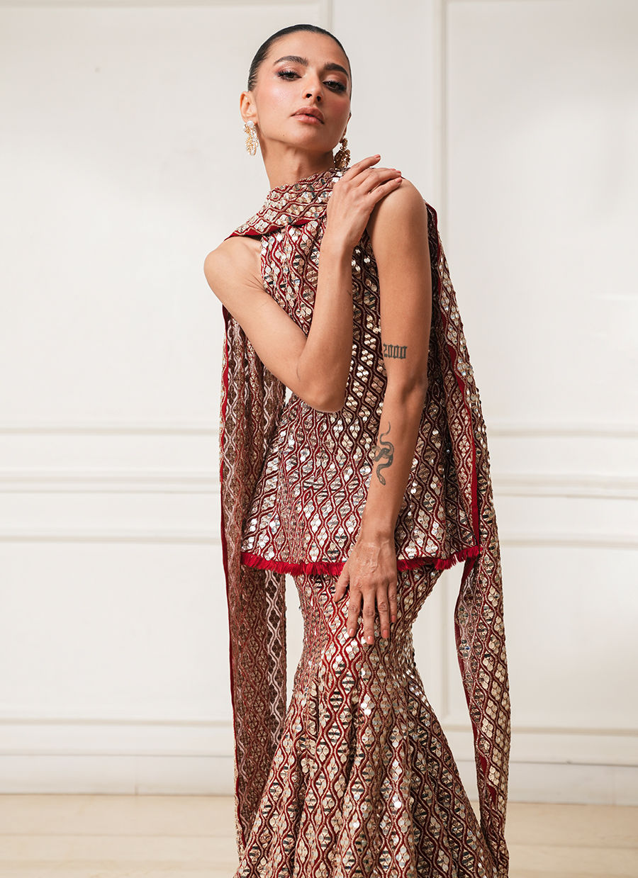 Red peplum paired with a mermaid lehenga, adorned with intricate foil and thread work throughout. Crafted in georgette chiffon, finished with delicate handmade threadwork edgings on the peplum and lehenga.