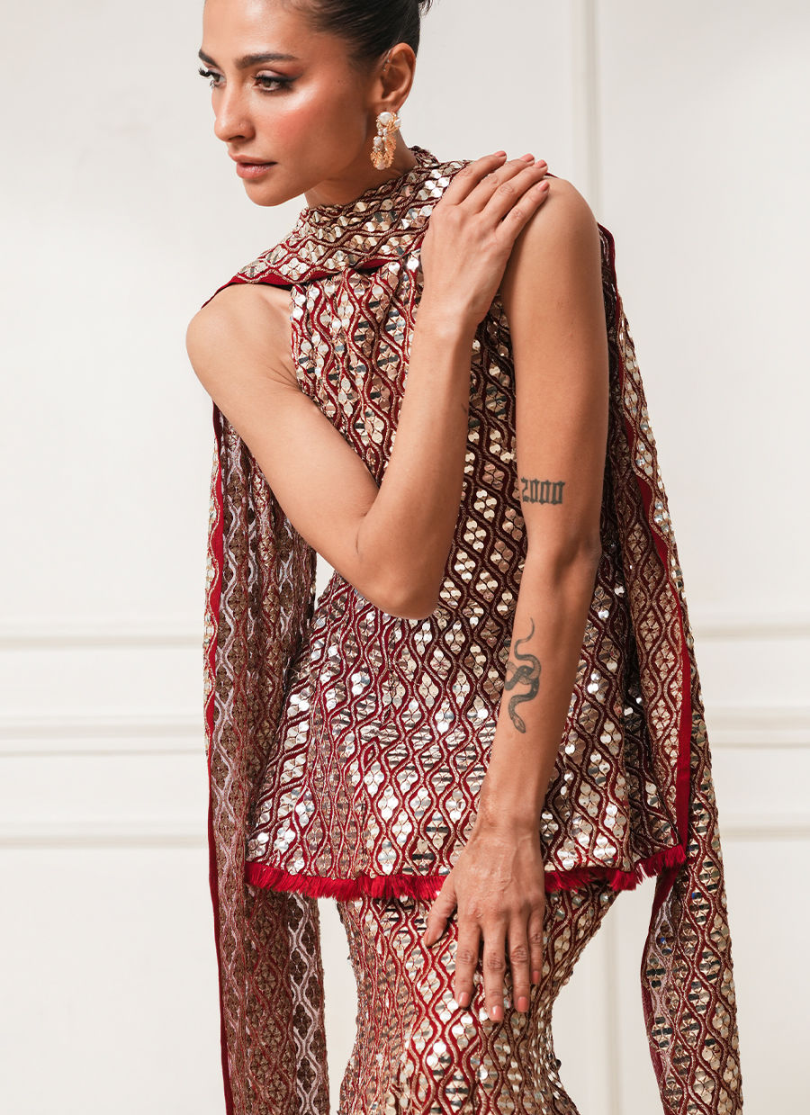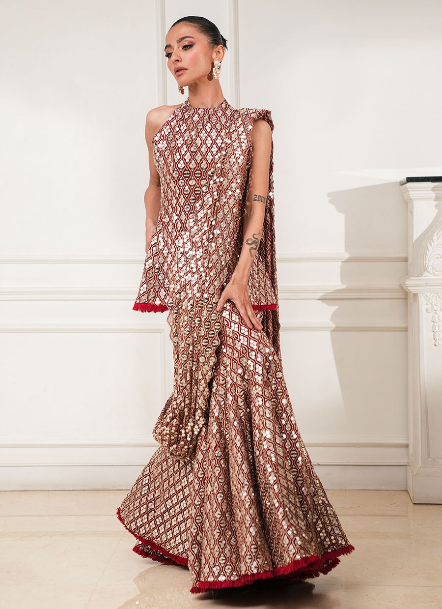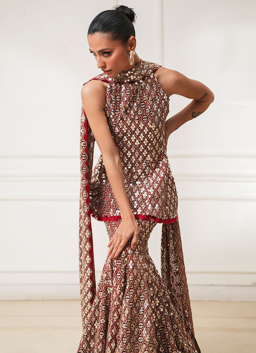 Red peplum paired with a mermaid lehenga, adorned with intricate foil and thread work throughout. Crafted in georgette chiffon, finished with delicate handmade threadwork edgings on the peplum and lehenga.
