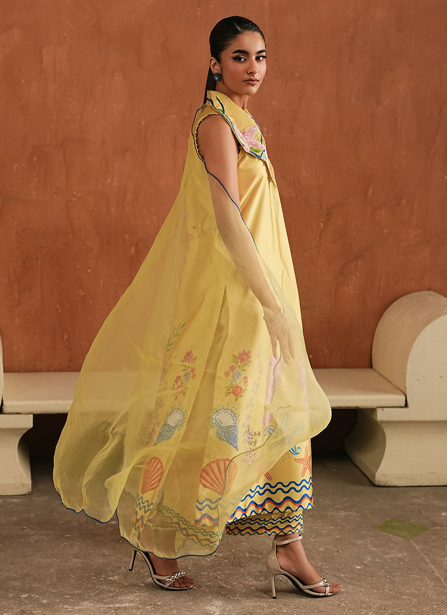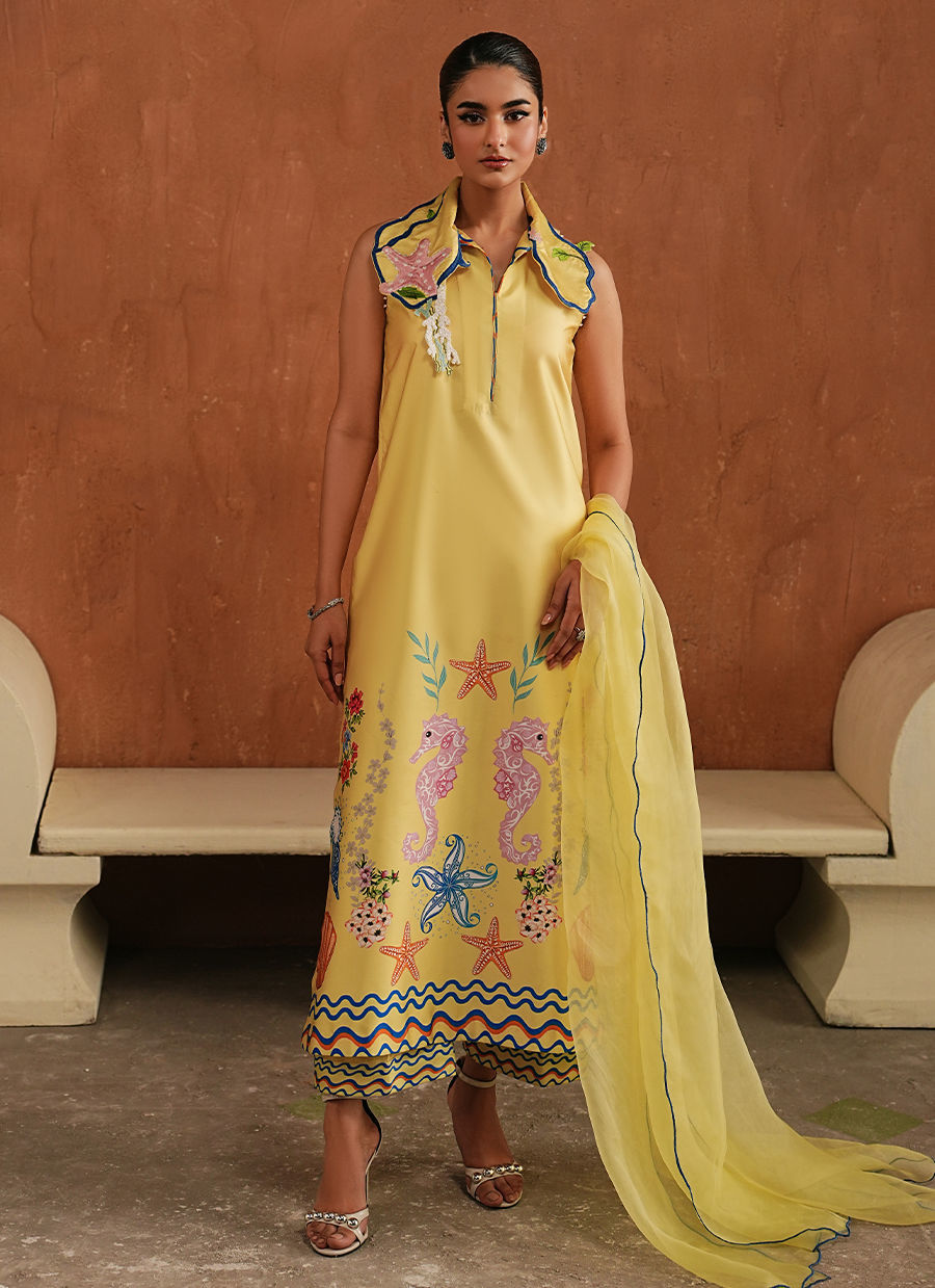 Love this article for its thoughtful details and easy character. Crafted in yellow printed Shamoze Silk, the long shirt is paired with relaxed culottes for movement and comfort. The collar is a true highlight, detailed with playful sea-life inspired elements that give the look its personality. Finished with an organza dupatta, embroidered along all four sides, this set is made for casual Ramadan evenings, daytime gatherings, and moments when you want something light yet distinctive.