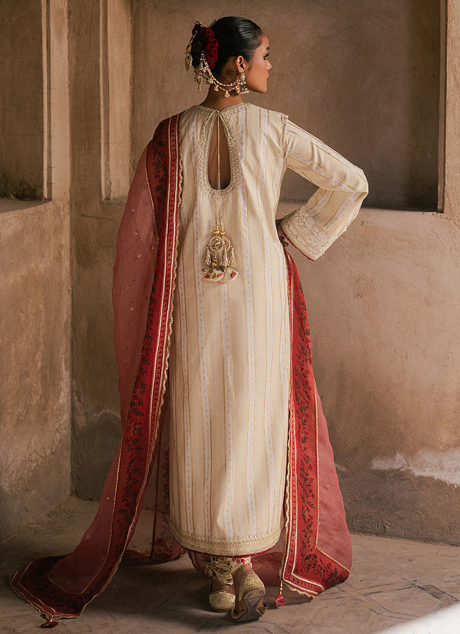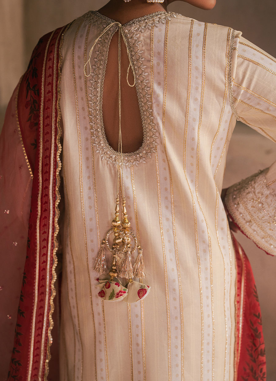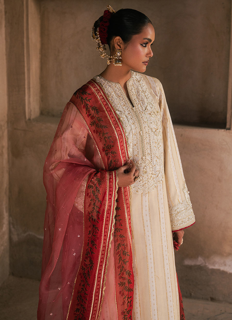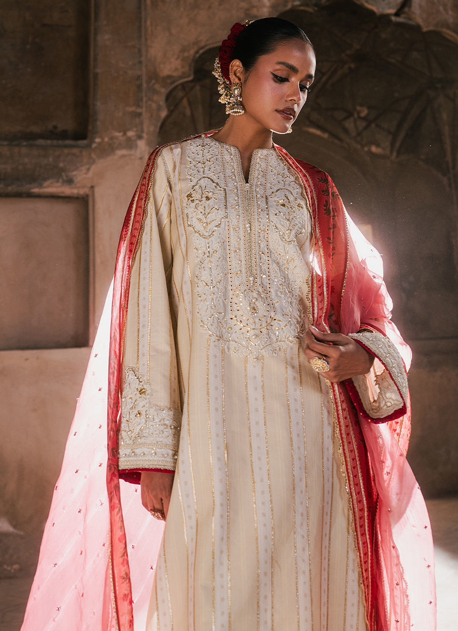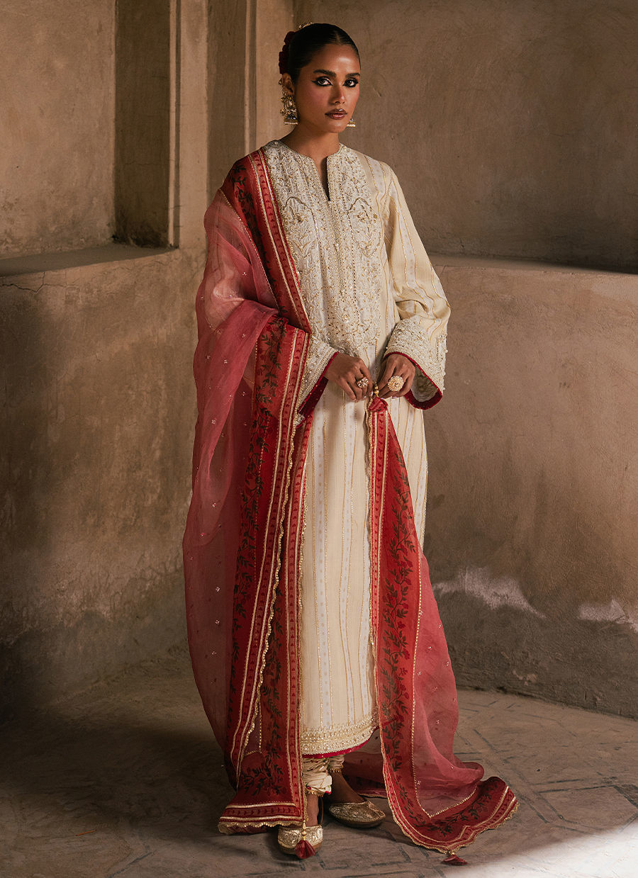 Sakoon, An ivory cambric printed shirt, elegantly adorned with detailed borders and a beautifully defined neckline, enriched with delicate adda work for a handcrafted finish. It is paired with a classic cambric chooridar, offering a sleek and timeless silhouette. The look is completed with a single chaan organza dupatta, finished with a printed border that adds a soft festive accent to this serene and refined ensemble.