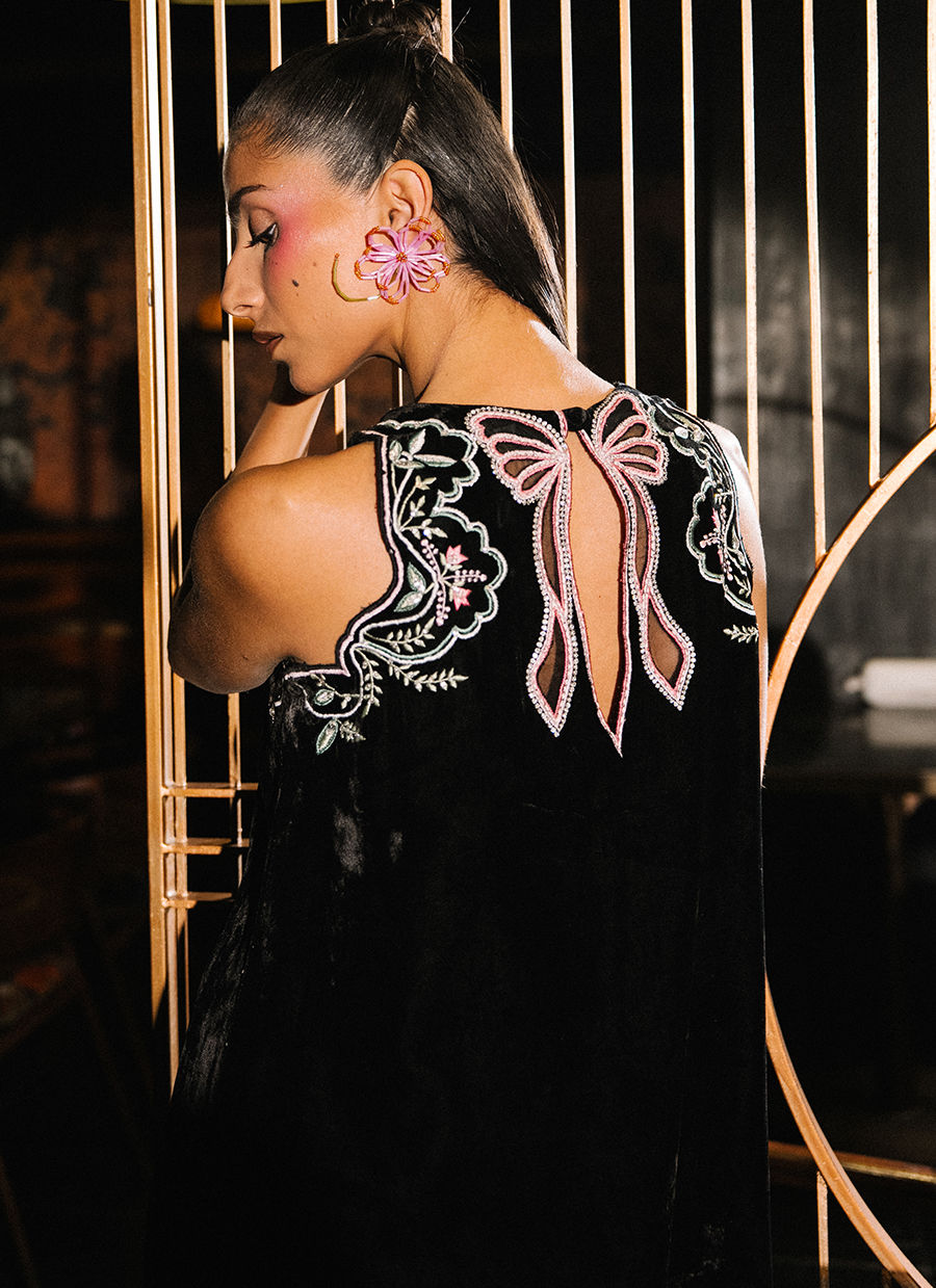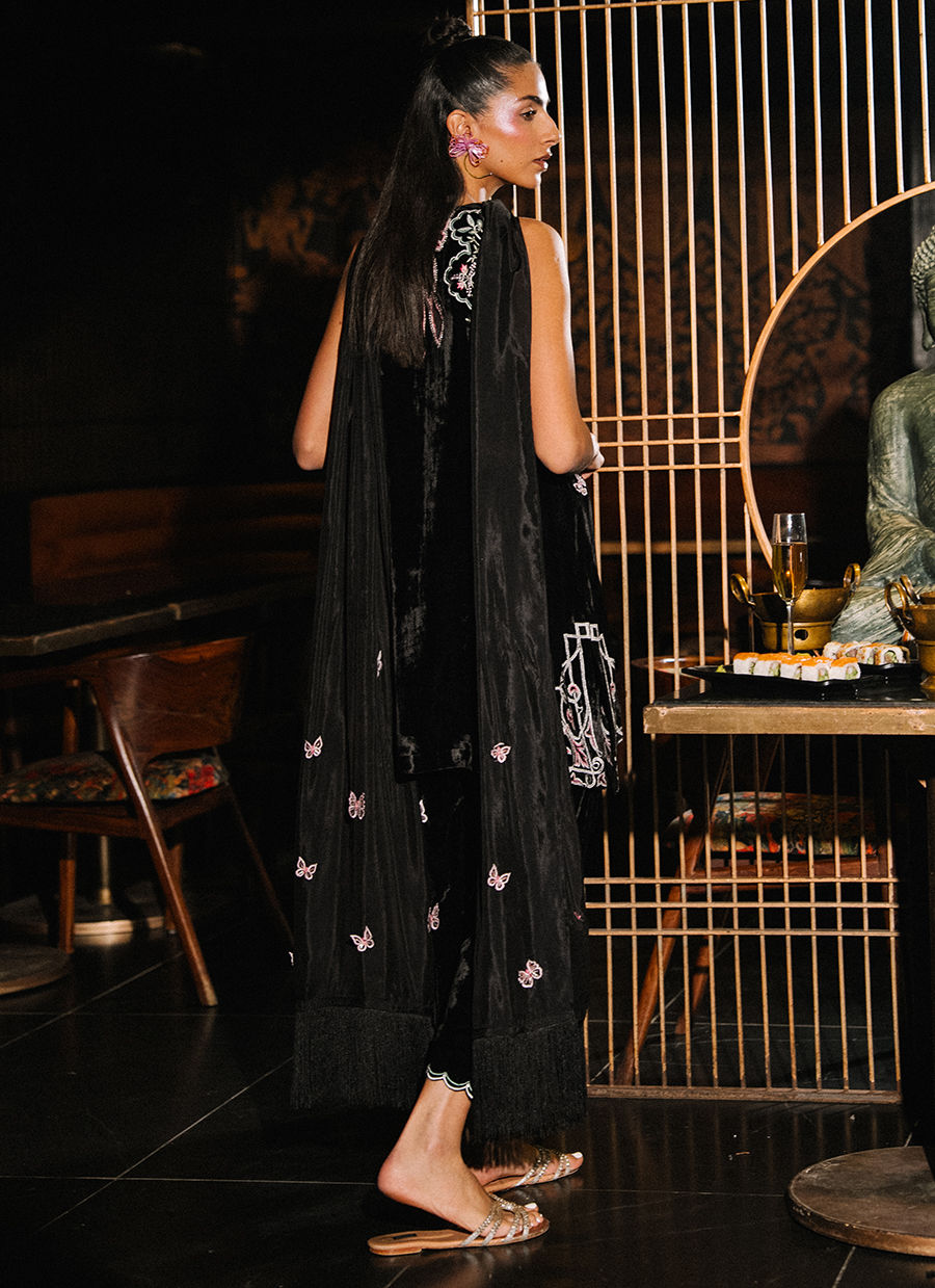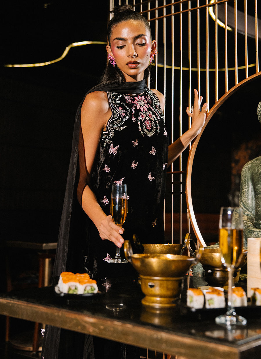 Crafted in rich black velvet, this shalwar kameez showcases multicolored floral resham embroidery intertwined with delicate butterfly motifs. Intricate handwork adds a refined shimmer. The back of the kameez is elevated with elegant bow details and sheer organza appliqué. A luxurious silk dupatta with 3D butterfly embellishments and fringe finishing pairs beautifully with the coordinating shalwar designed with signature bow details.