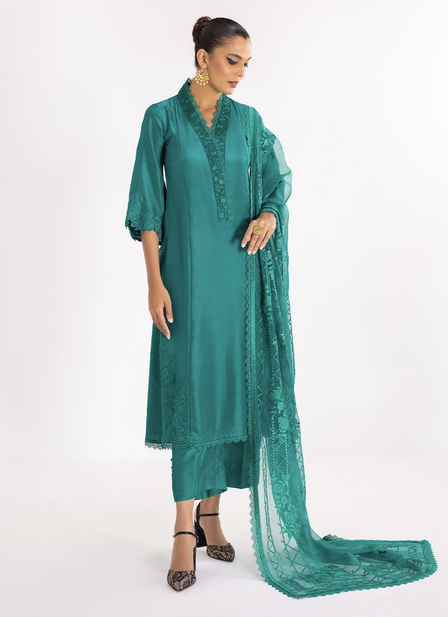 Indulge in the elegance of this solid emerald green kurta, enhanced with a beautifully embroidered neckline and embroidered detailing on the daman and sleeves. The ensemble includes matching ijaar pants. Together, these elements create a harmonious and stylish outfit.