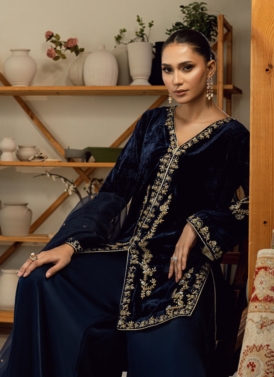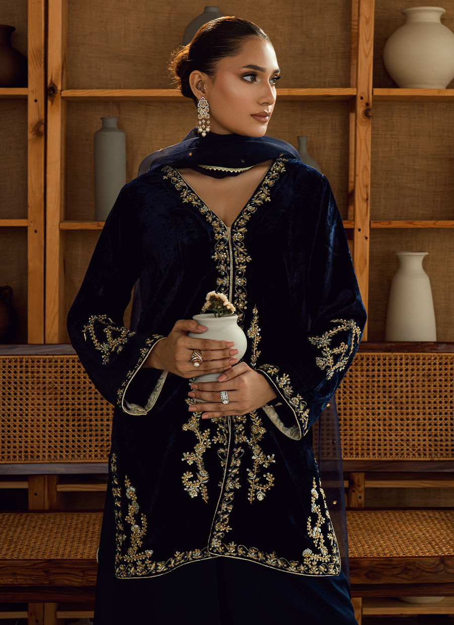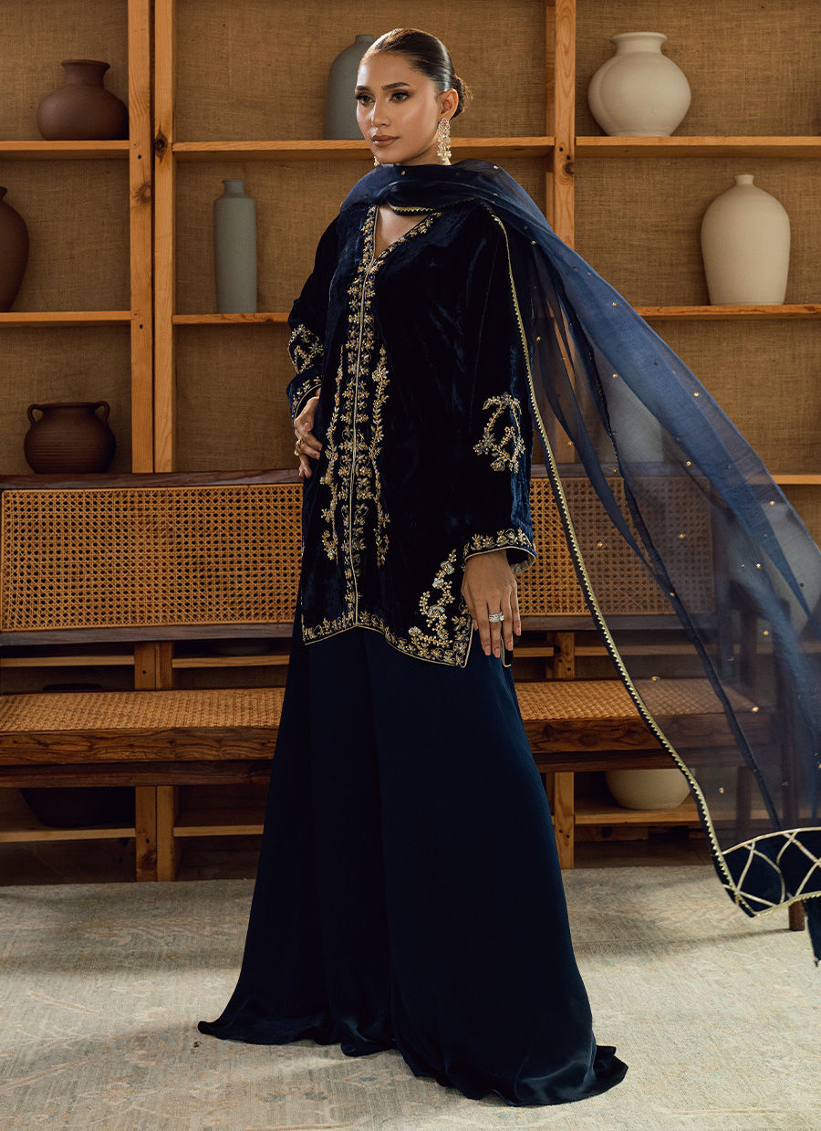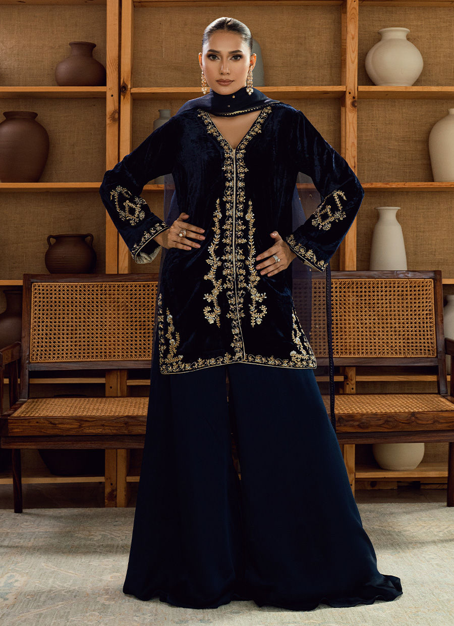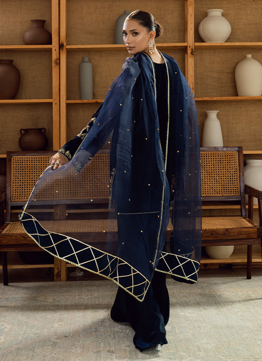 A statement of timeless poise and regal craftsmanship, Sapphire Legacy embodies the grace of deep sapphire tones blended with handcrafted finesse. The short shirt showcases exquisite handwork along the neckline, daman, and sleeves, reflecting hours of meticulous artistry and elite tailoring. Paired with a traditional silk gharara, this ensemble redefines classic elegance with a modern attitude. The organza dupatta, light yet opulent, adds a layer of ethereal charm—making Sapphire Legacy an ideal choice for formal soirées, festive occasions, and luxury gatherings. Bold yet graceful, Sapphire Legacy is designed for the woman who carries tradition with modern sophistication—a living portrait of strength and style.
