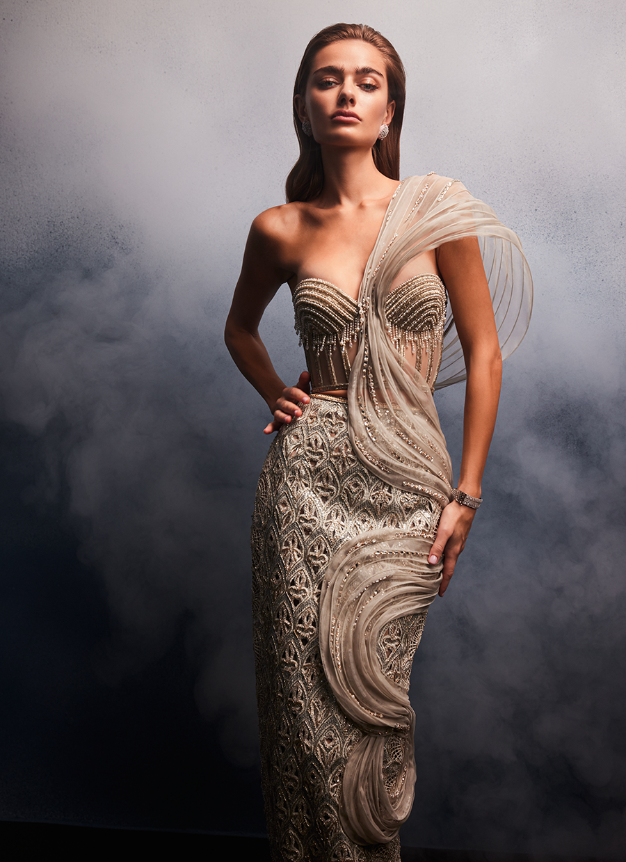 This haute couture dress captivates with a grey figure-hugging skirt adorned in cutdana pearls and Swarovskies, seamlessly connecting to a fully embellished corset. The ensemble is elevated by a short, intricately detailed jacket, culminating in a look of modern elegance and meticulous craftsmanship.