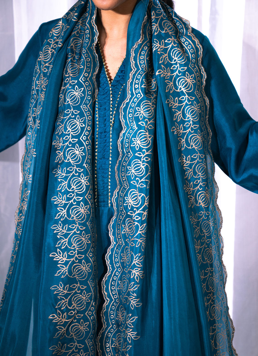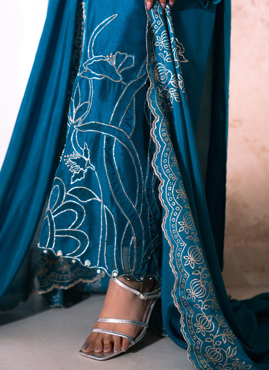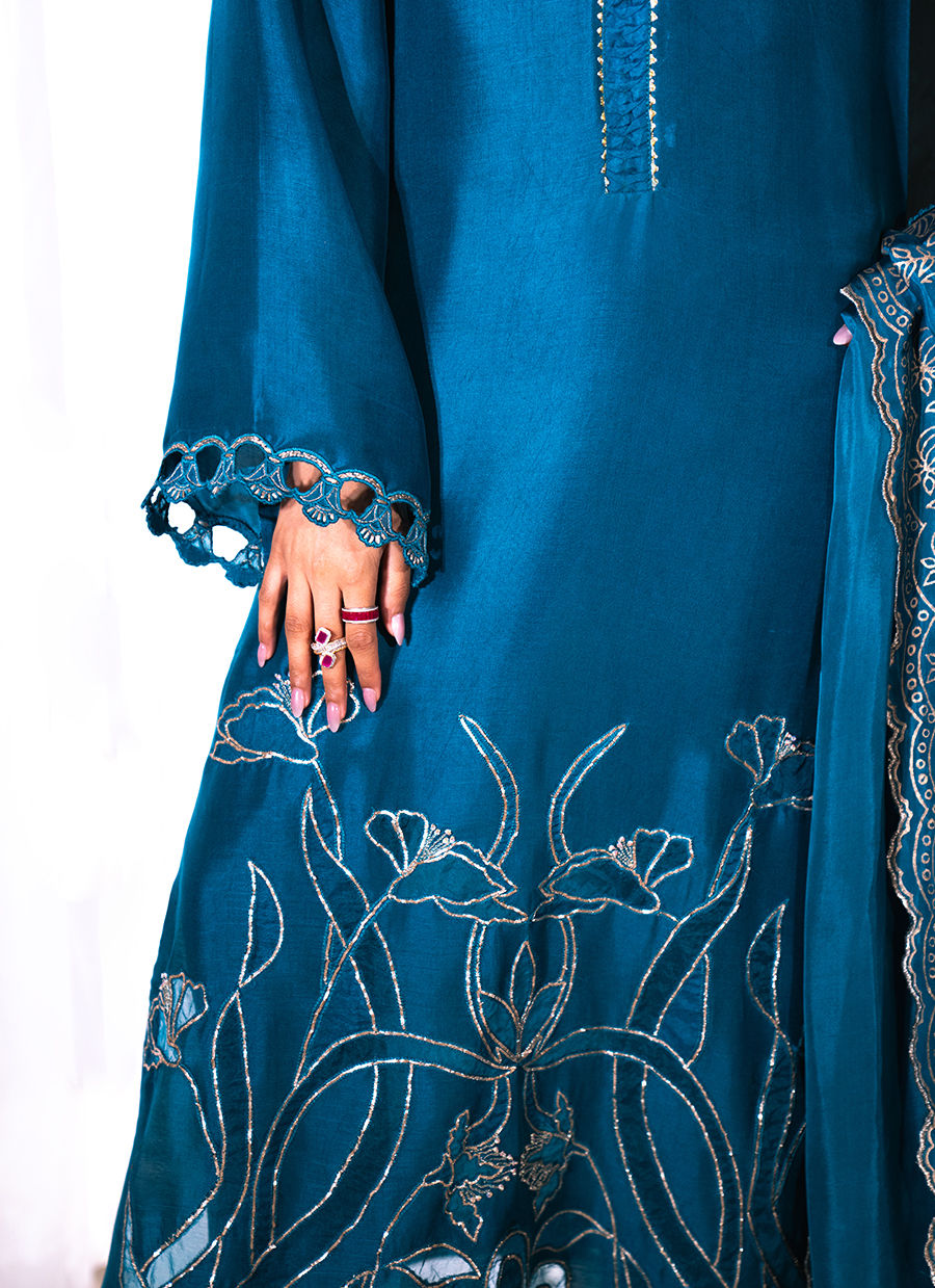 A refined expression of modern luxury, this tropical blue silk ensemble is designed with timeless elegance. The long silk shirt features a graceful V band neckline, finished with a golden edging that adds a refined accent. The sleeves are delicately detailed with cutwork, enhanced with fine golden pitta work outlining for an artisanal touch. The shirt hem is adorned with intricate organza appliqué cutwork, beautifully enhanced with rich golden pitta embroidery and scalloped edges, creating a statement finish. Paired with a coordinated silk trouser, the ensemble is completed with a luxurious silk dupatta featuring rich golden block printing, lending depth, heritage, and sophistication to the overall look. A distinguished creation crafted for those who appreciate understated luxury and meticulous craftsmanship.